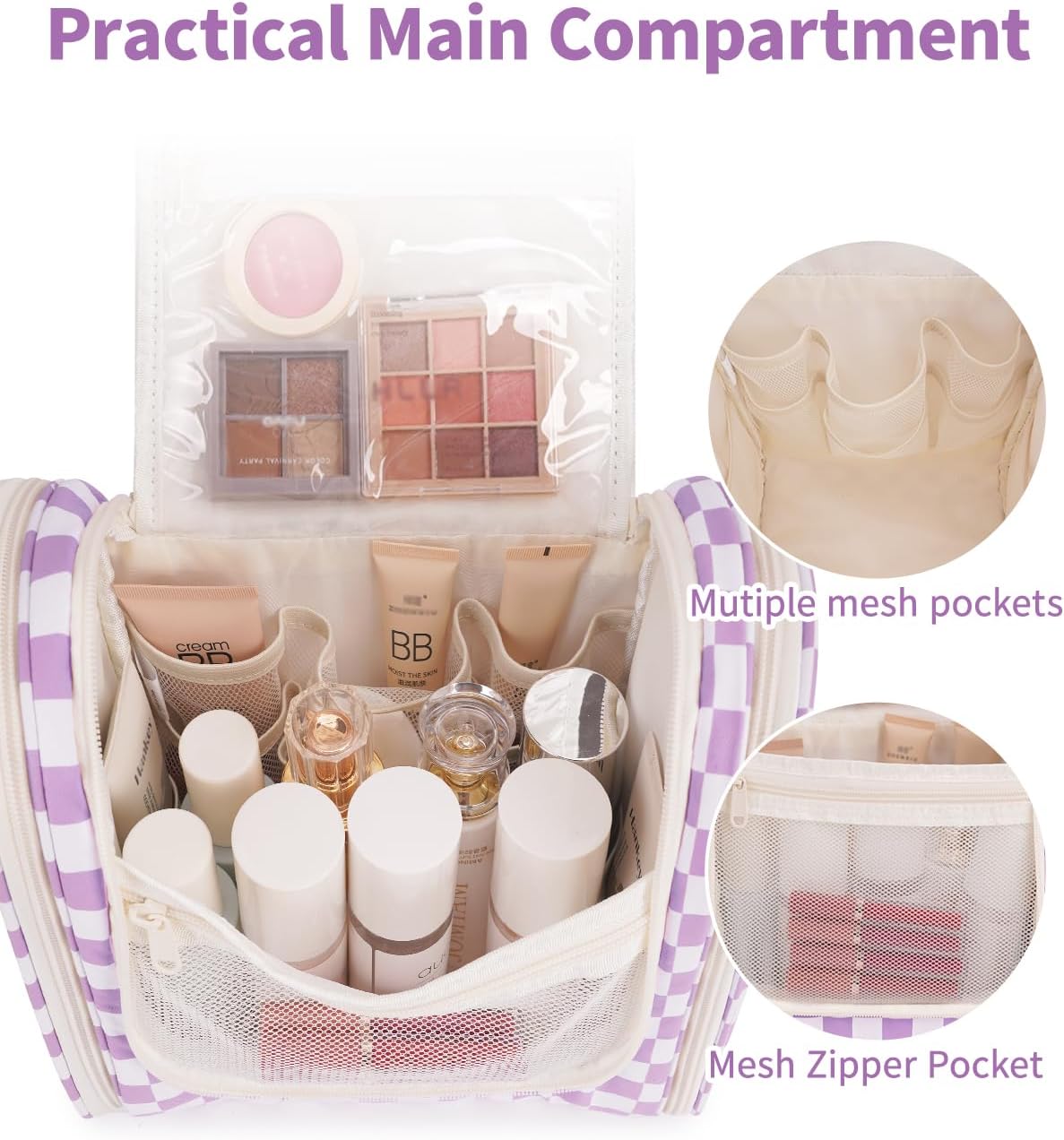 Narwey Checked Hanging Travel Toiletry Bag for Women, Travel Bag for Toiletries, Makeup Bag Organizer Cosmetic Bags Make Up Bags for Women (Purple Checkerboard)