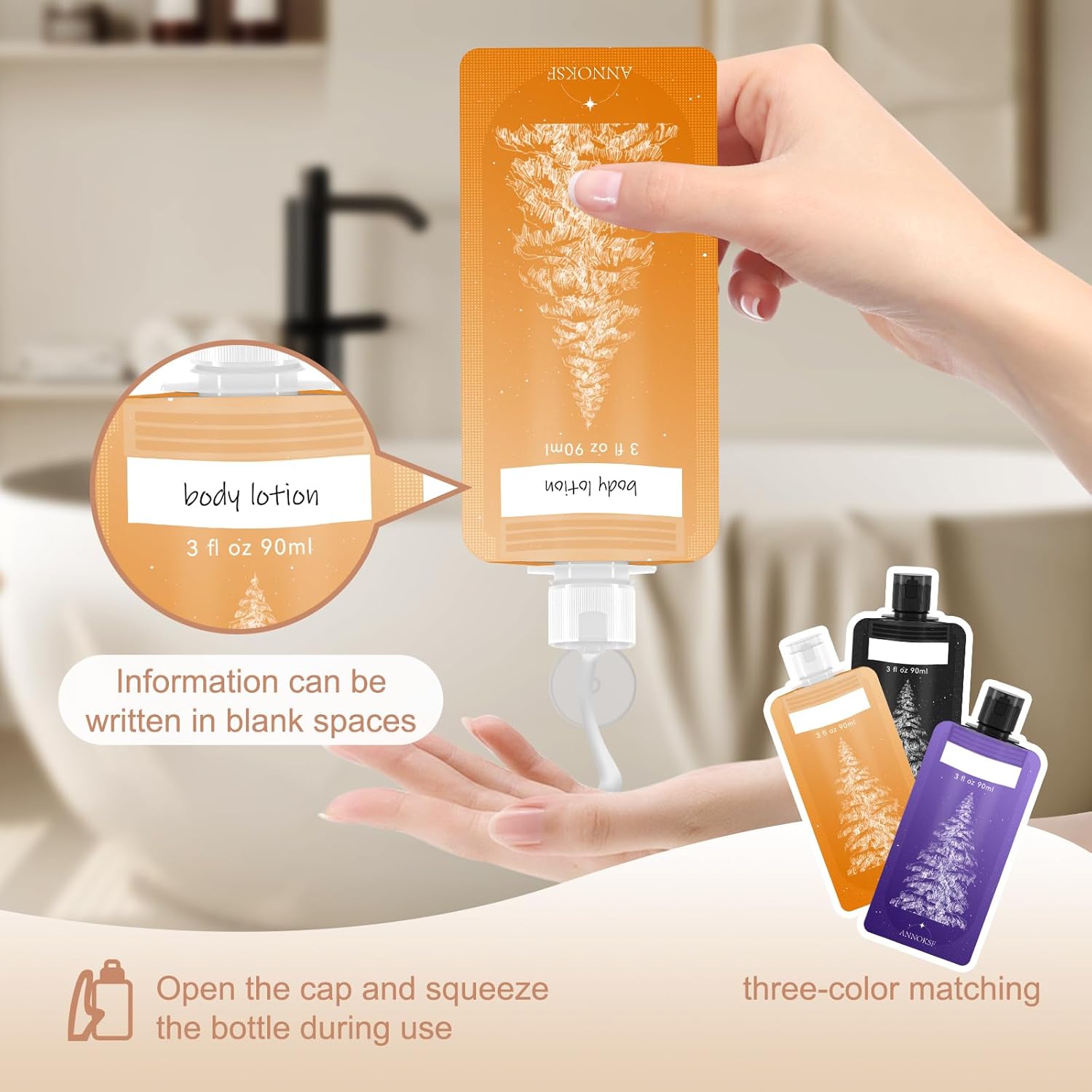 - Multi-Purpose: The 0.7-inch wide-mouth design makes it easy to fill shampoo, conditioner, body wash or lotion into the push bottle. Stylish print and label strip design allows you to quickly differentiate between items