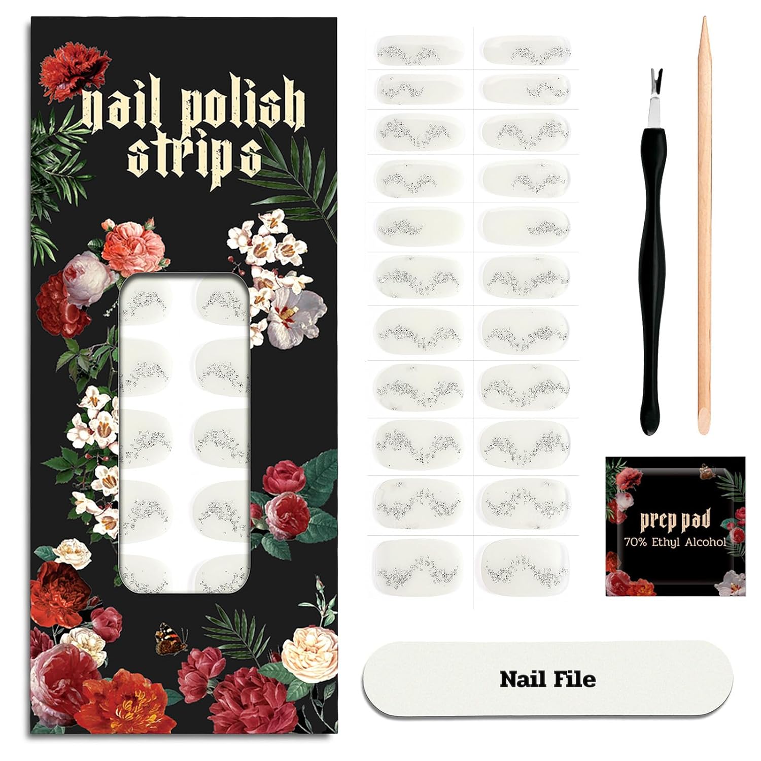 Nail Polish Strips - 22 Pcs Salon Quality Gel Nail Stickers - Long Lasting Wraps (Snow Lotus White Flower)