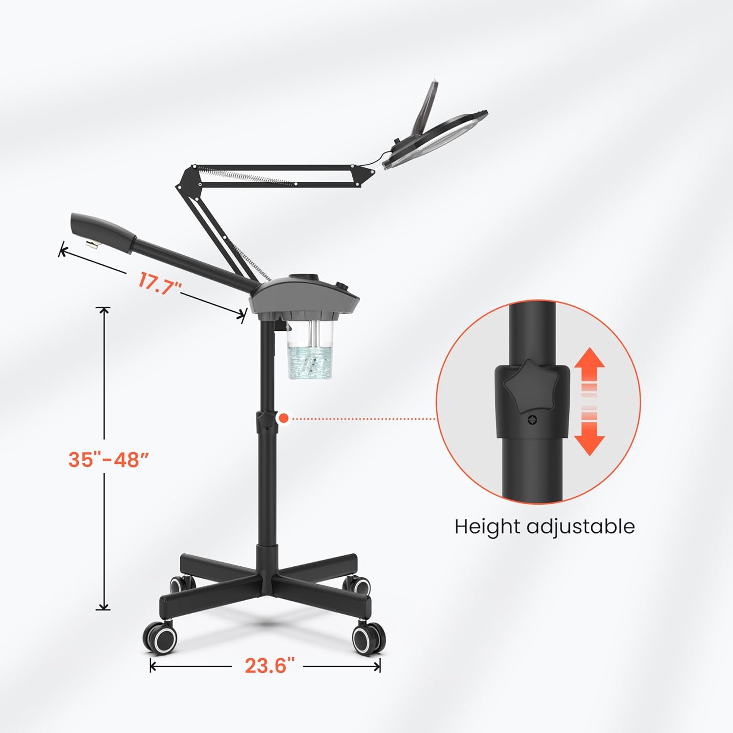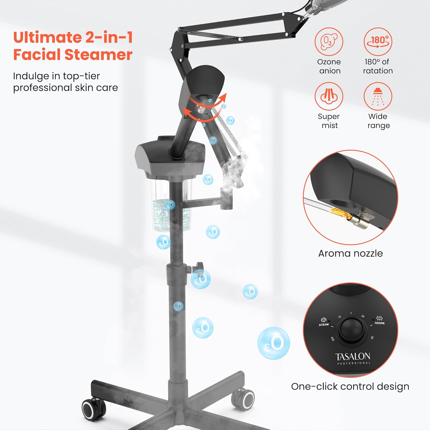 - Easy To Use:The facial steamer with 4 leg wheeled stable stand base that allows you to move around in the salon freely. The 360 degree rotating lens and 180 degree flip-up/down design allow personalized adjustments for an optimal skincare experience.