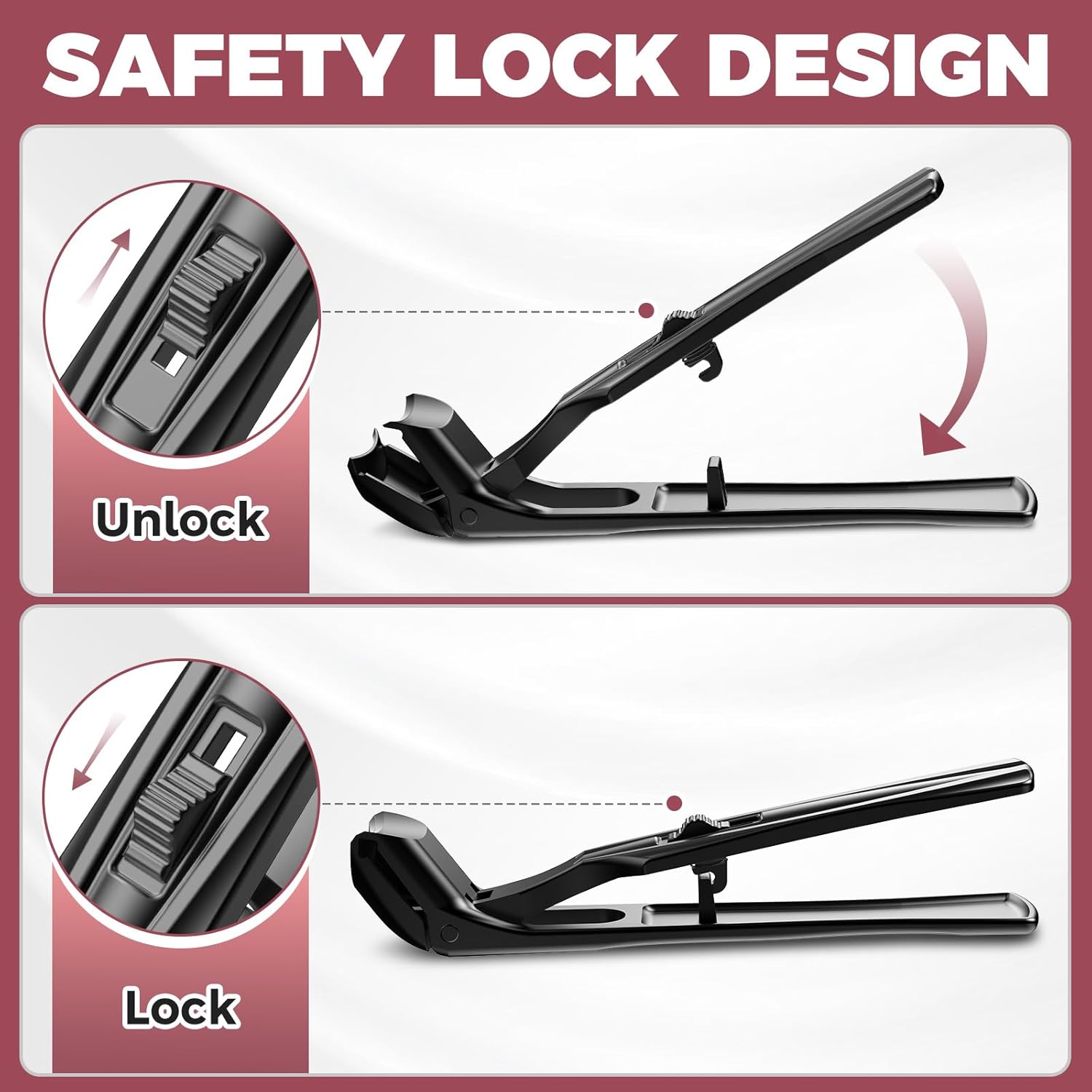 - Nail Clippers with Catcher - Large nail clippers come with a catcher which can effectively collect the clippings, prevent them from splashing or hurting eyes accidentally. You can comfortably trim nails on bed or sofa without worrying about leaving messy nail clippings on sheets, carpet or couch. Mens toenail clippers come with a safety lock to ensure safety and are also easy to carry. Simply push the slide lock into the safe position when not in use.