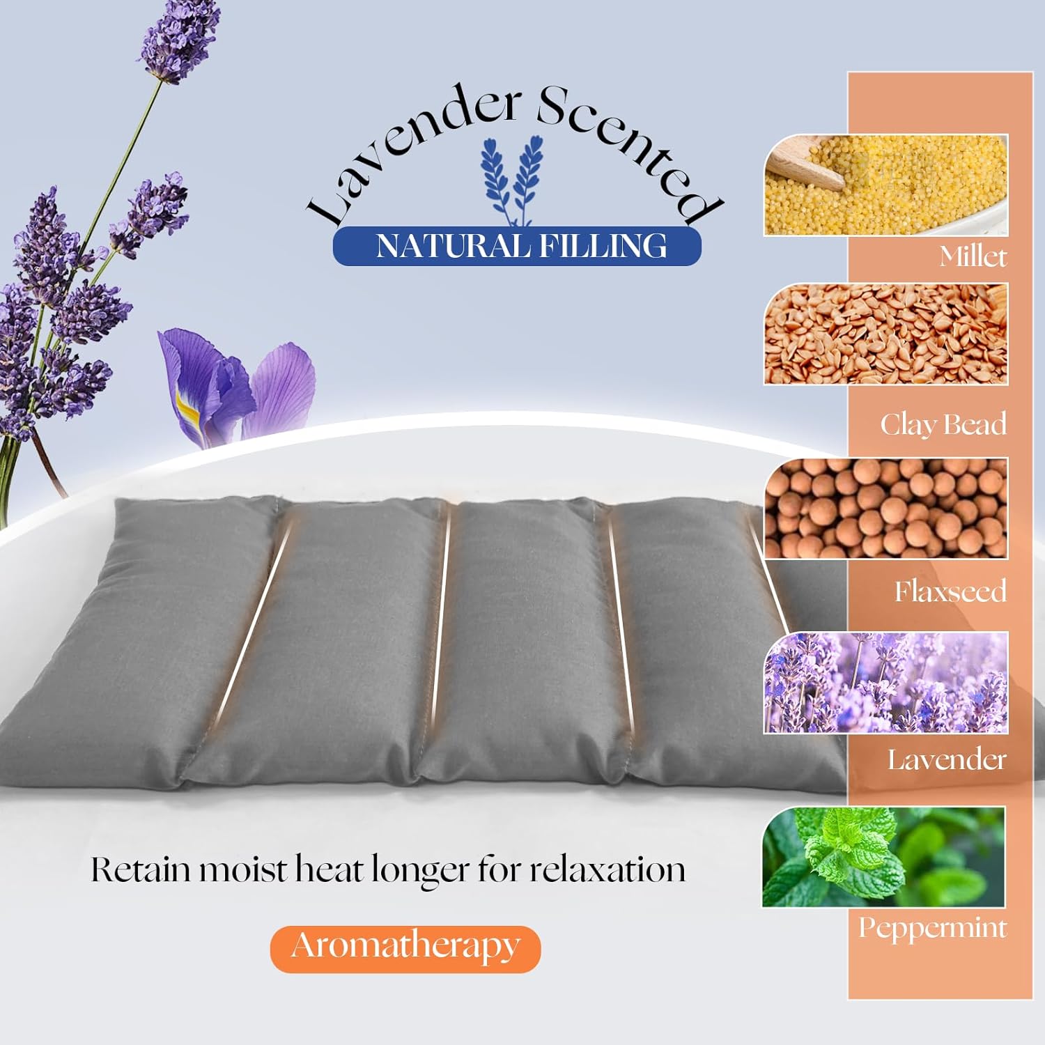 • Natural Lavender & Peppermint Scent – Filled with flaxseed, millet, clay beads, lavender and peppermint this heating pad releases a calming aroma when warmed. The moist heat lasts for extended relaxation.