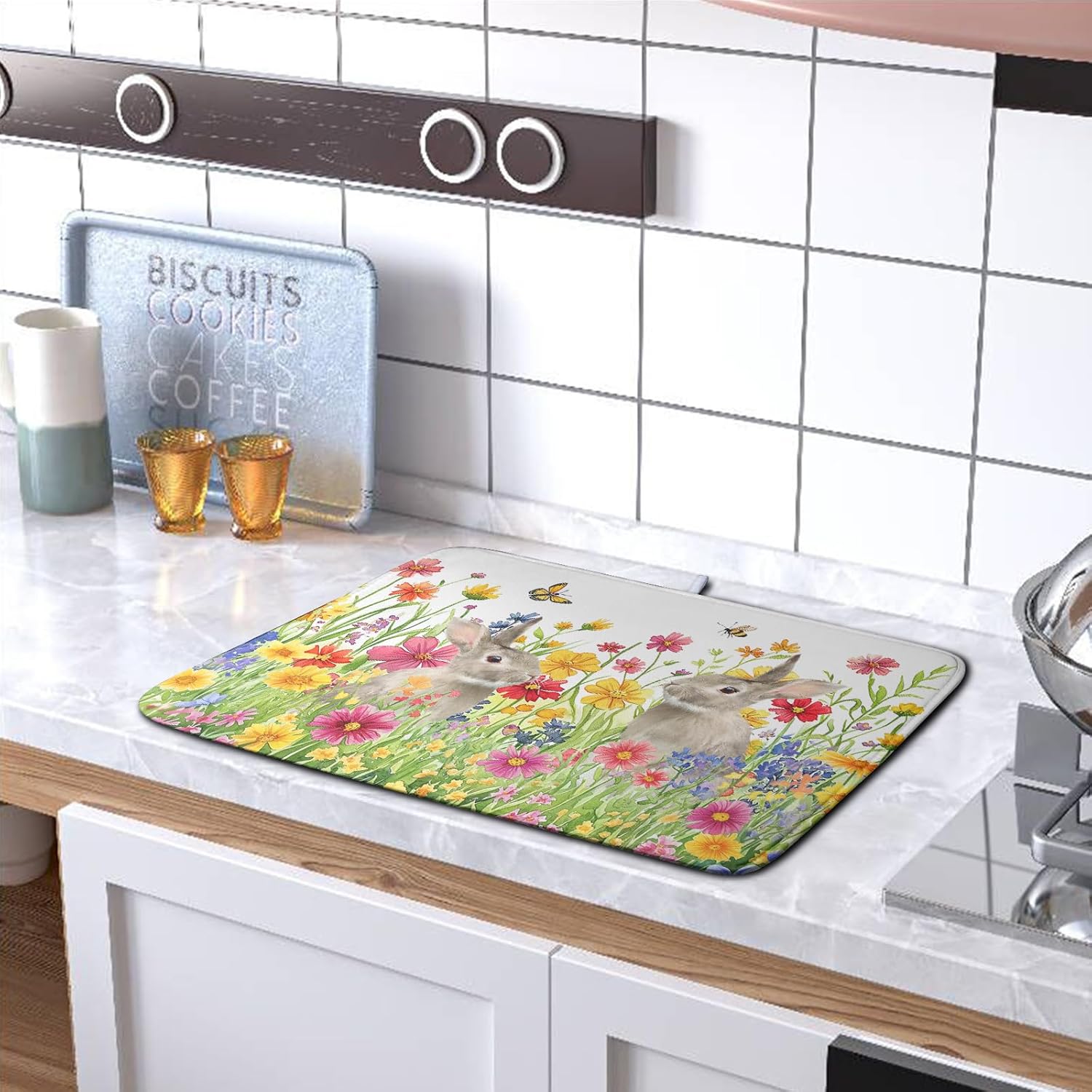 Easter Dish Drying Mat for Kitchen Counter Easter Bunny Flowers Dish Drying Pad Spring Rabbit Floral Dishes Drainer Mats Absorbent Microfiber Kitchen Countertop Protector Drying Mats 18x24 in
