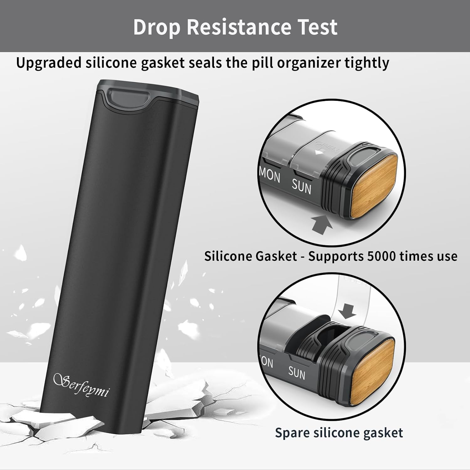 Metal Weekly Pill Organizer, Serfeymi Aluminum Daily Pill Box(Spare Gasket Provided),7 Day Pill Case Travel Medicine Organizer,Pill Containers with Individual Lid for Vitamins,Pills, Supplement-Black