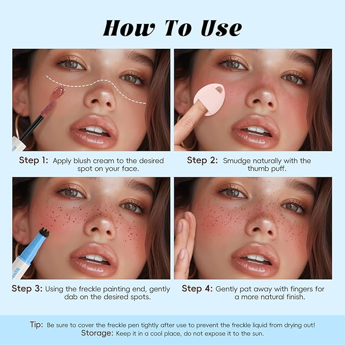 - Easy to Create A Sunkissed Freckle Makeup: take an appropriate amount of blush dotted on the cheeks, with a puff evenly patted away, with a horizontal “W” shaped cross point method of pressing freckle stamps, patting with the fingertips to obtain a natural and realistic freckle makeup. Attention: Close the cap immediately after use to avoid the liquid drying up and rendering the product unusable