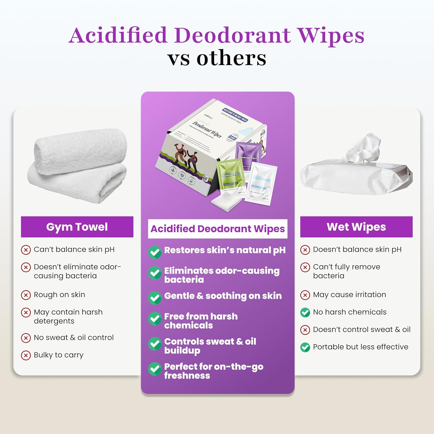 - pH-BALANCED TO PREVENT ODOR & SWEAT BUILDUP – Unlike regular wipes that only cover up odor, our acidified formula works with your skin’s natural pH to neutralize odor-causing bacteria, reducing the need for harsh deodorants.