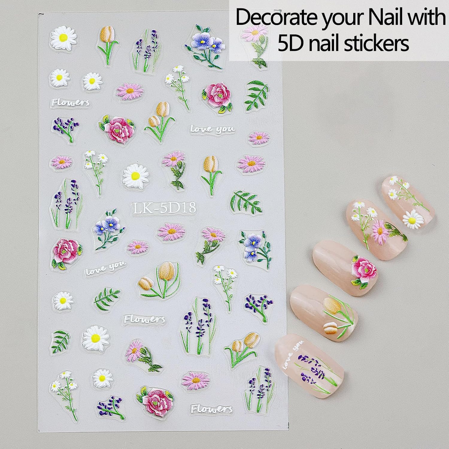 Flower Nail Stickers for Nail Art 5D Embossed Nails Decals Self Adhesive Spring Summer Floral Nails Decoration for Women 3D Design Colorful Flower Daisy Lavender Supplies