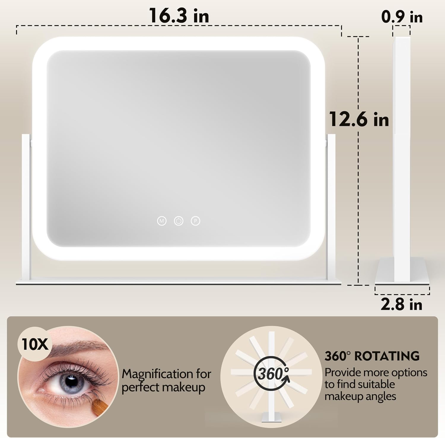 - 【360° Rotation & Stable Aluminum Frame】This vanity mirror is oversized at 16''x12'' to clearly display your entire face, with easy 360° swivel adjustment, ideal for makeup, skincare and hair styling. Crafted with a robust aluminum frame, the mirror provides excellent stability,effectively preventing tipping.