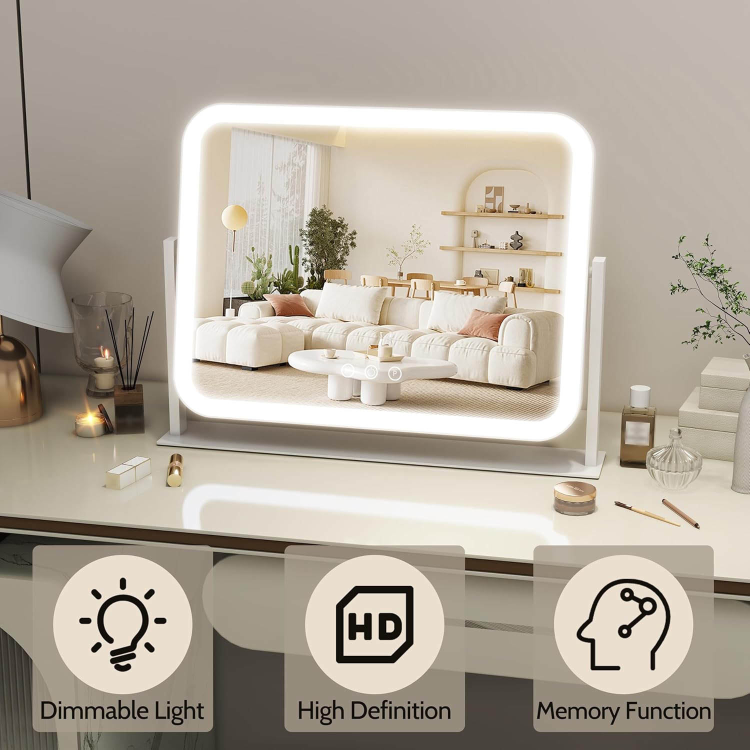 - 【3-Color Lighting & Stepless Dimming】Featuring three adjustable color settings (Cool White, Warm White, Natural White) for diverse makeup environments. Effortlessly slide your finger for precise brightness control (0-100%), ensuring shadow-free, even illumination every time.