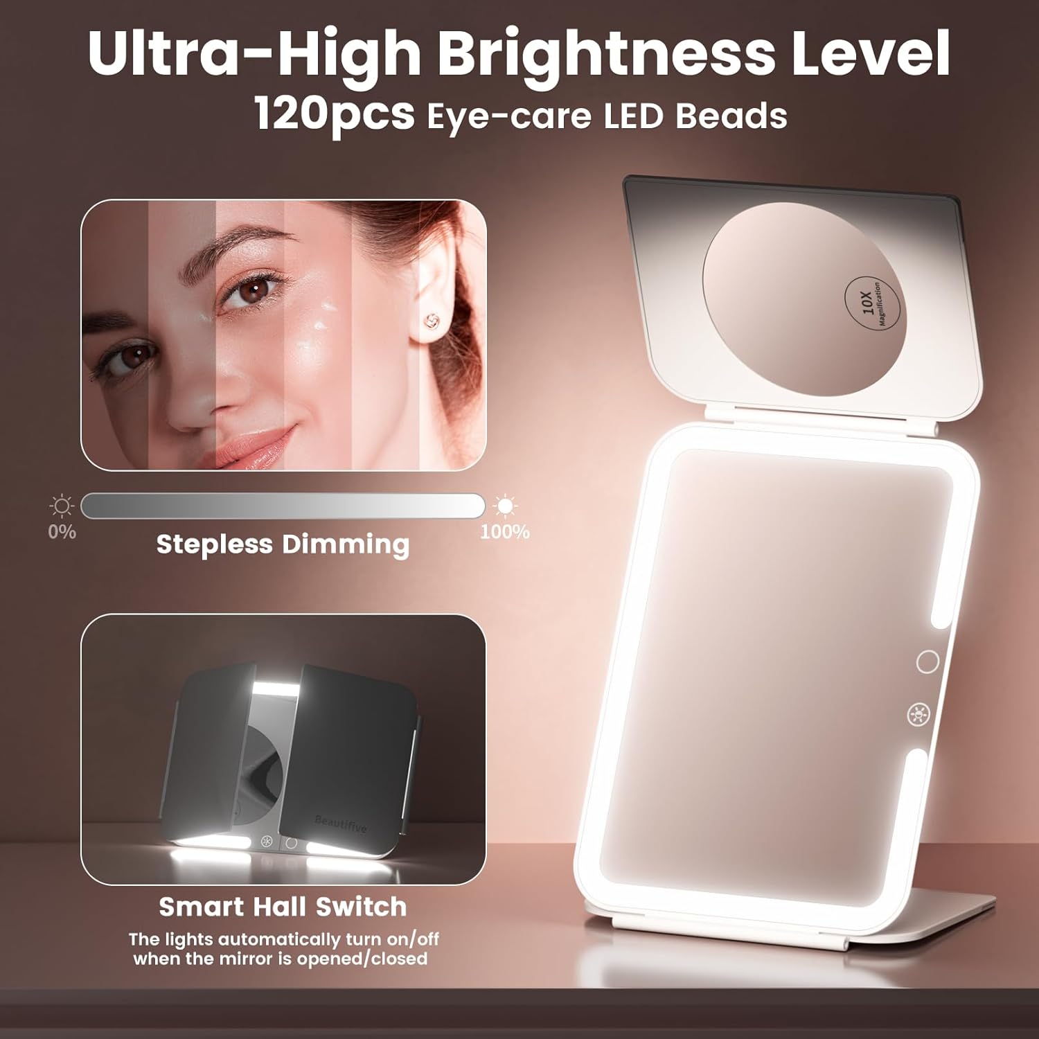 Trifold Travel Lighted Makeup Mirror, 5000mAh Rechargeable Light Up Magnifying Mirrors 1X/3X/10X, 3 Color Lighting&Stepless Dimming, Ultra Bright and Multi-Angle Adjustment