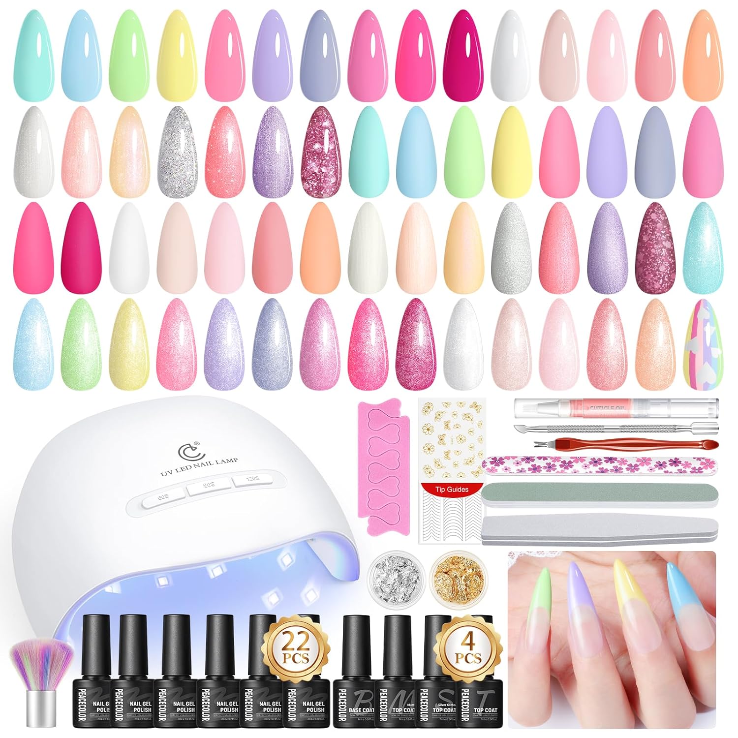 - 22PCs Pastel Gel Polish Set: This gel nail polish kit includes 22 colors gel polish in light shades, covers all summer colors needed in the nail art process, like nude, pink, green, blue, yellow, glitter etc. The soft, dreamy pastels are a flawless match for spring and summer, adding a fresh, effortless touch to your look.