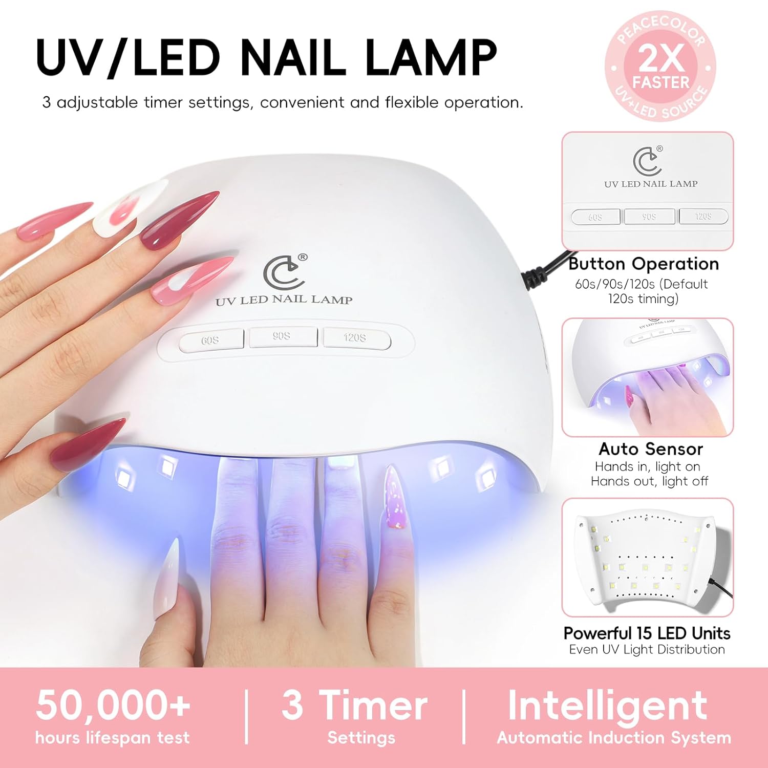 - Nail Lamp: The U V lamp has 15 LED beads,which can evenly irradiate 180 degrees without dead angle.Powerfully and Efficiently, can maximally save your curing time.The nail lamp has 3 Timer Setting 60S / 90S / 120S, make the process of manicure more convenient. The U V nail lamp have smart auto-sensing:hands in, light on; hands out, light off.