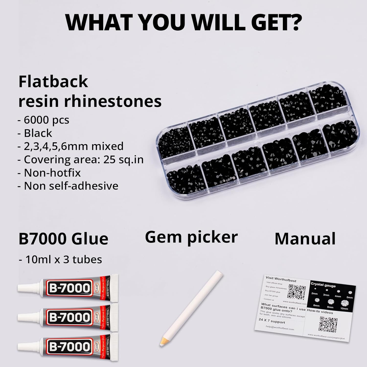 - Package Content with Tool (pickup pen and manual) -- The bedazzler kit Package includes 1 black rinestones set with 12 grids, 6000 pcs of 2,3,4,5,6mm bling-out resin rhinestones