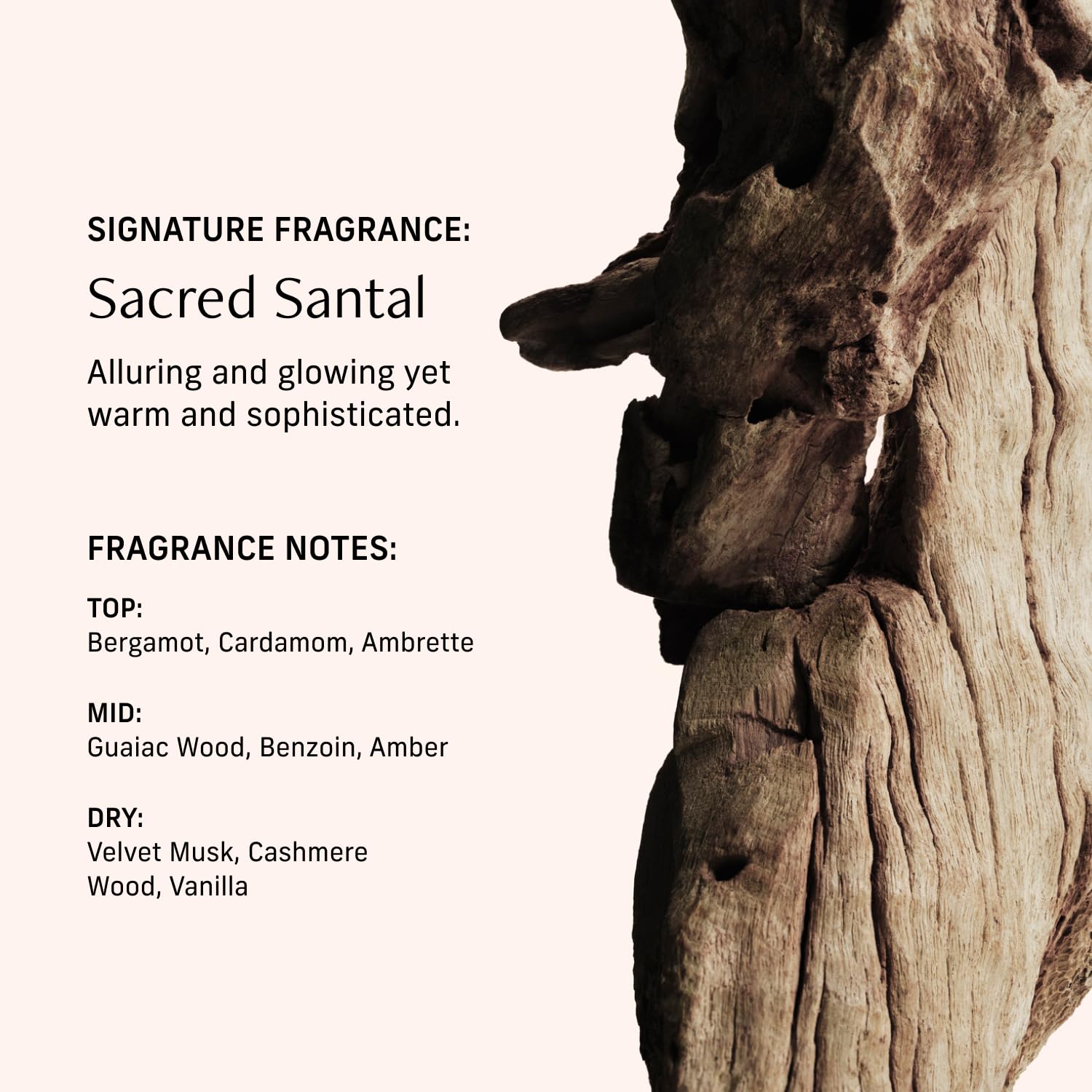 - SACRED SANTAL SCENT: Cardamom, amber, cashmere woods, and vanilla create a luxurious fusion of warmth, spice, and creamy depth. We developed Sacred Santal for an all-day scent that’s alluring, glowing, warm, sophisticated, and seductive.