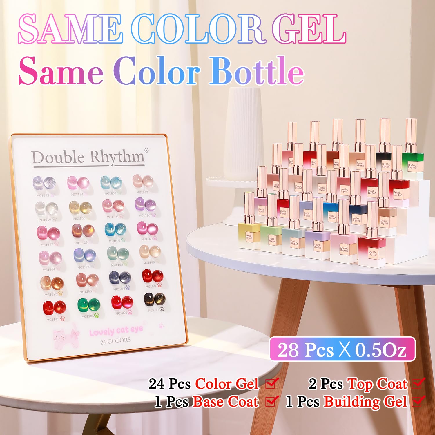 Double Rhythm 28Pcs 0.5Oz Cat Eye Gel Nail Polish Set Same Color Same Bottle Soak Off Magnetic Gel Polish Kit Nail Art Manicure Salon DIY at Home (Silver Gold Red Black-T24-7)