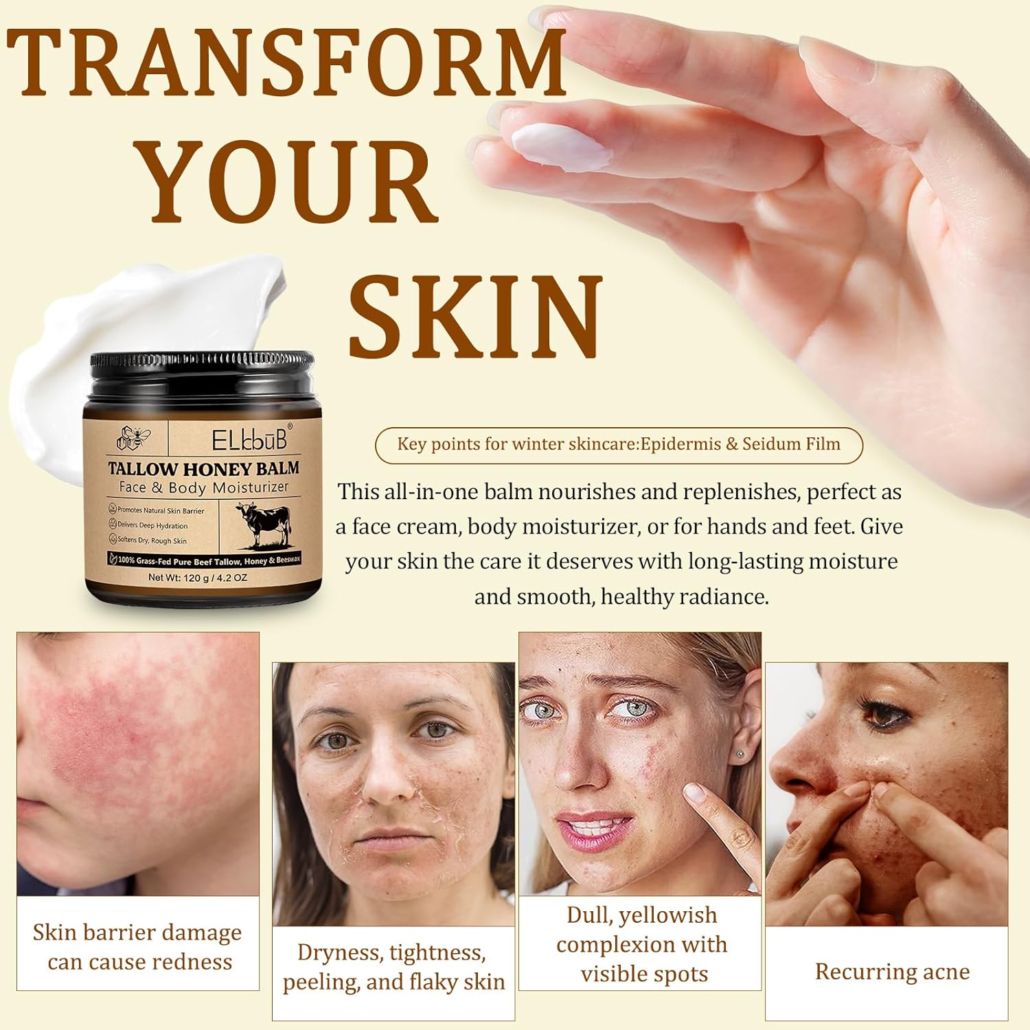 - Premium Natural Ingredients: Made with organic, grass-fed beef tallow, raw wild honey, and beeswax, providing superior skin nourishment.