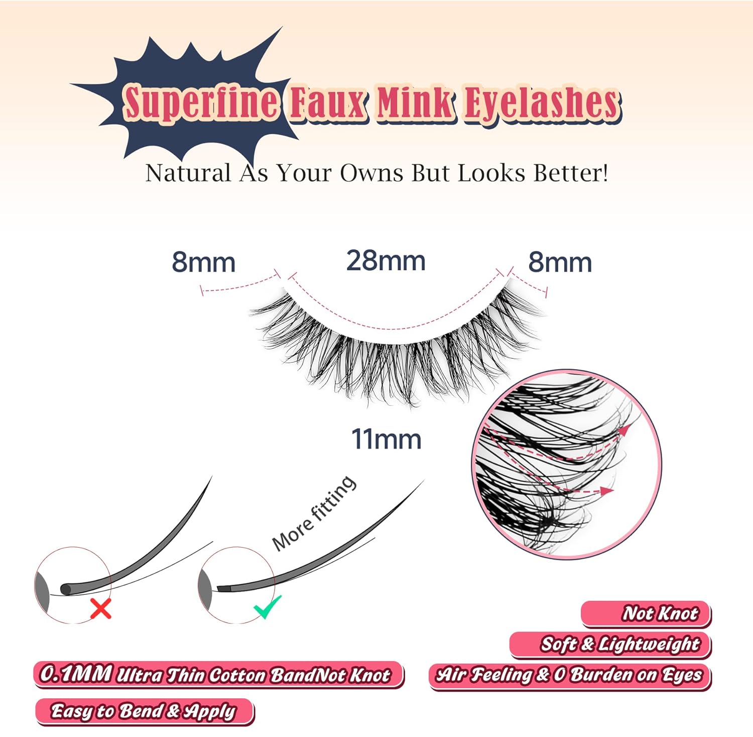 - THIN BAND FALSE EYELASHES: The wispy eyelashes use 0.1mm thin cotton flat band tech, seamlessly blend to your real eye lashes. Incredibly flexible, easy to bend and stay well on, beginner friendly