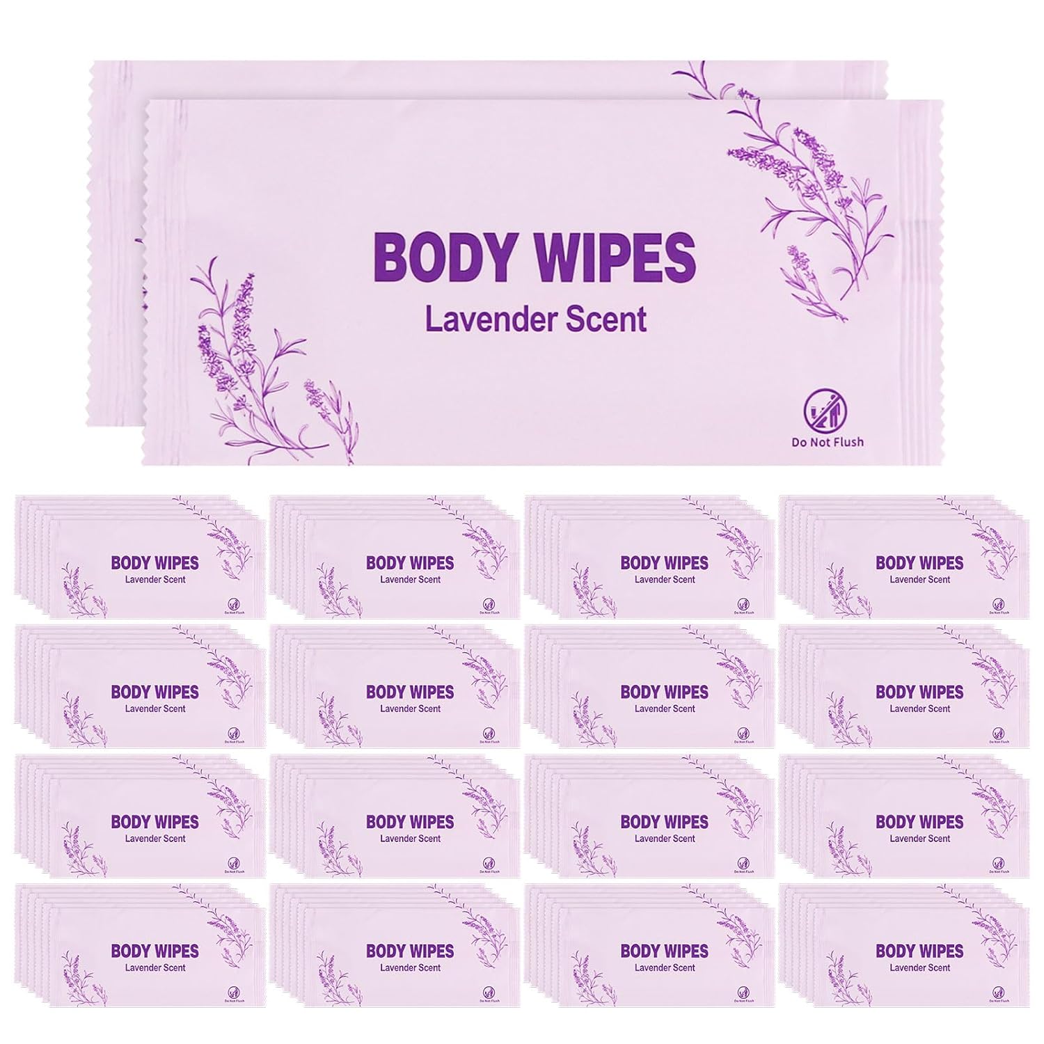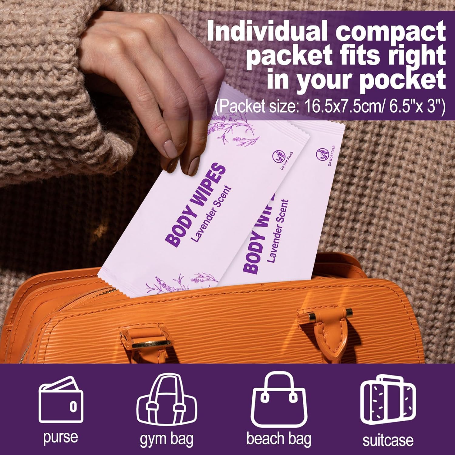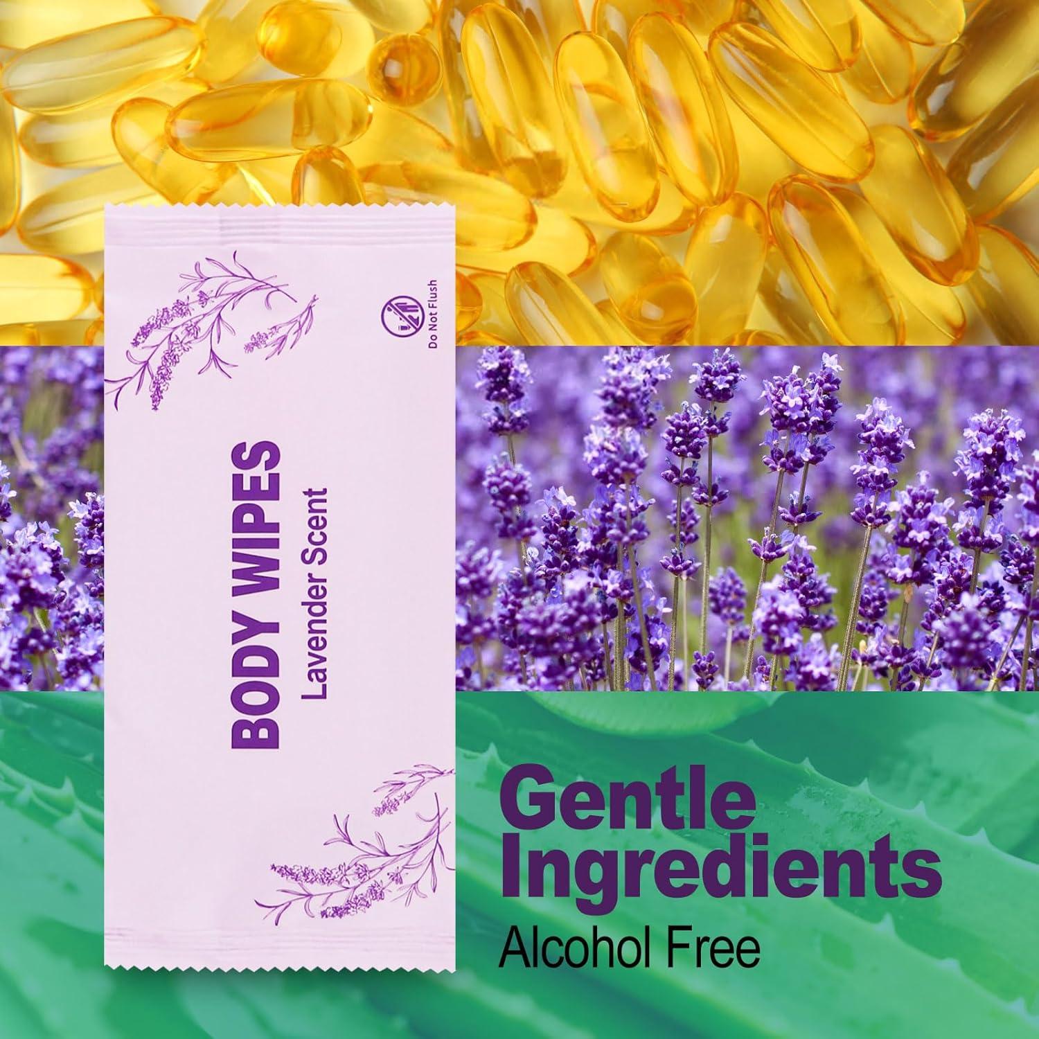 - GENTLE INGREDIENTS: Body wipes travel size are alcohol free, enriched with lavender and aloe essence, gently remove odor without leaving sticky residue, refresh you with a mild and pleasant scent, safe for sensitive skin and daily use