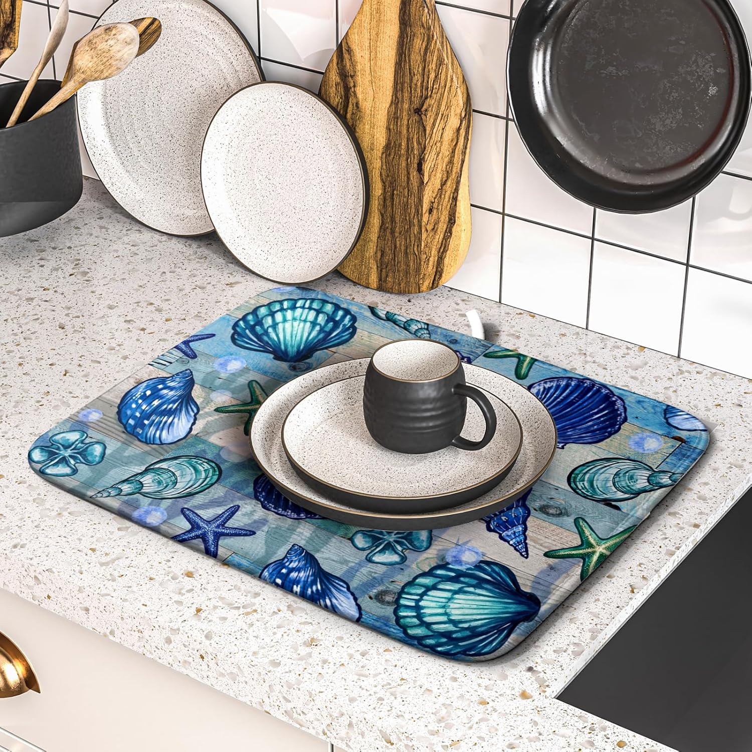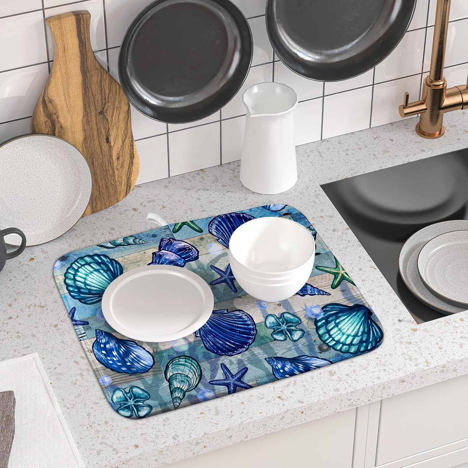 Starfish Seashell Dish Drying Mat 16x18 inch Coastal Beach Dish Drainer Rack Pad Absorbent Microfiber Fast Dry Kitchen Counter Accessories