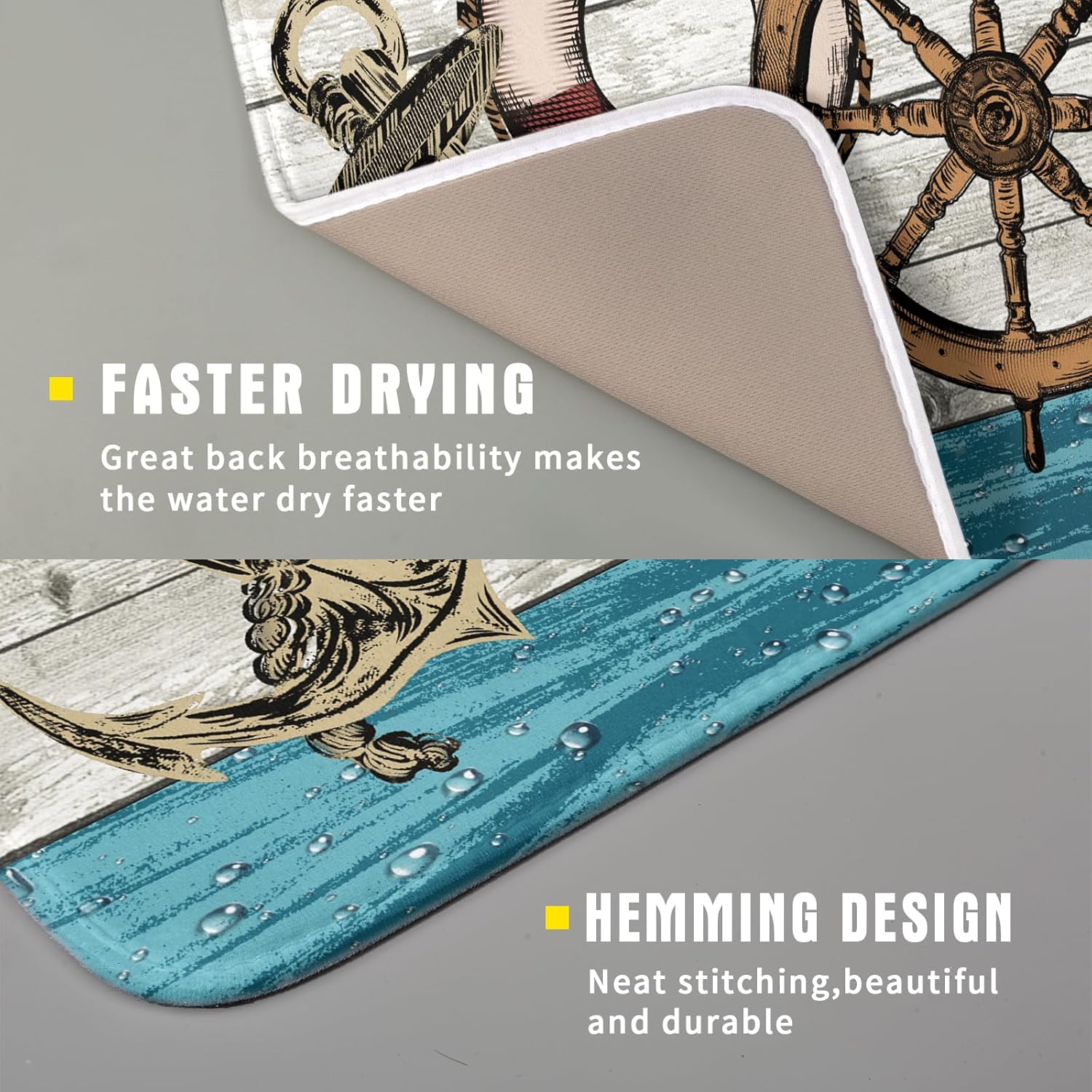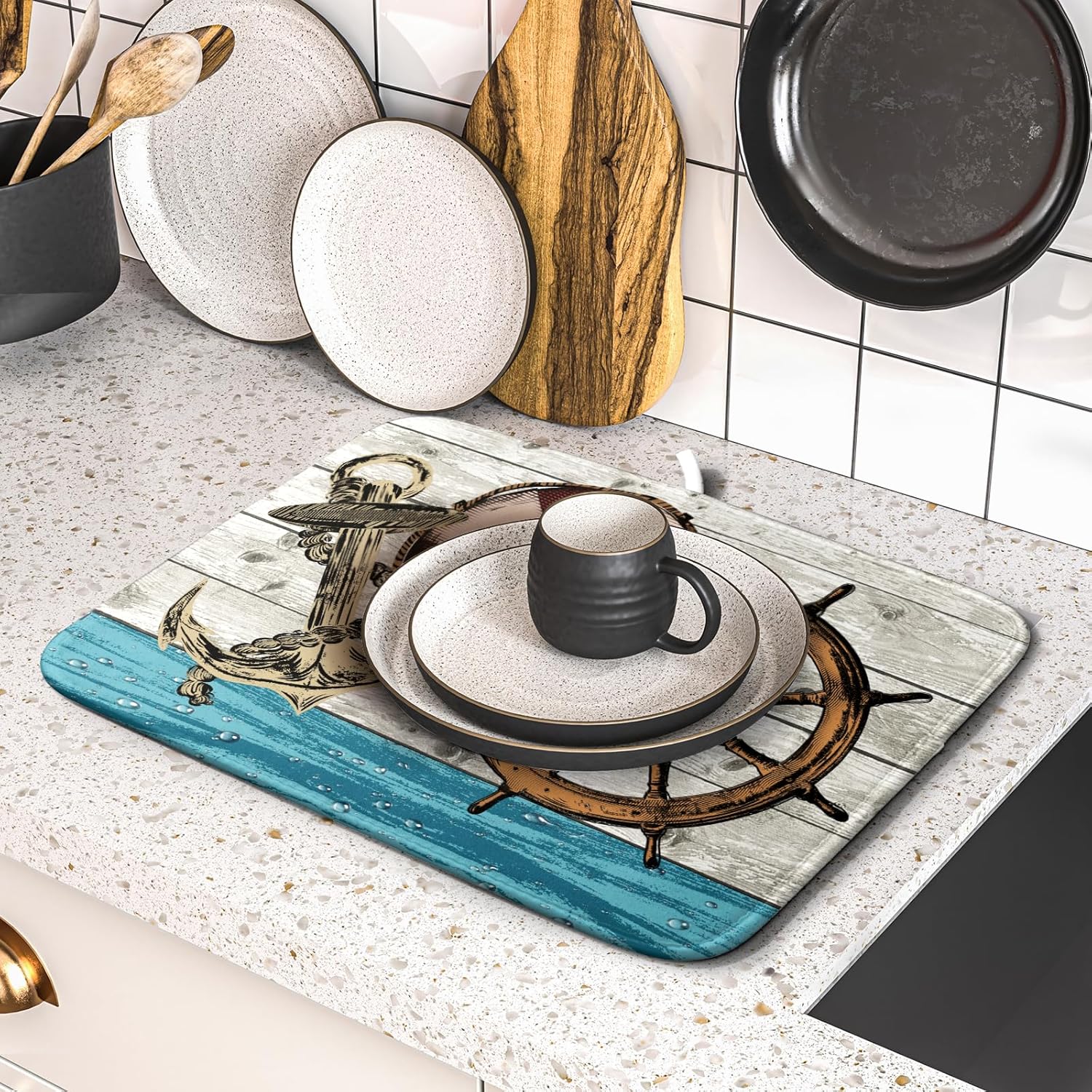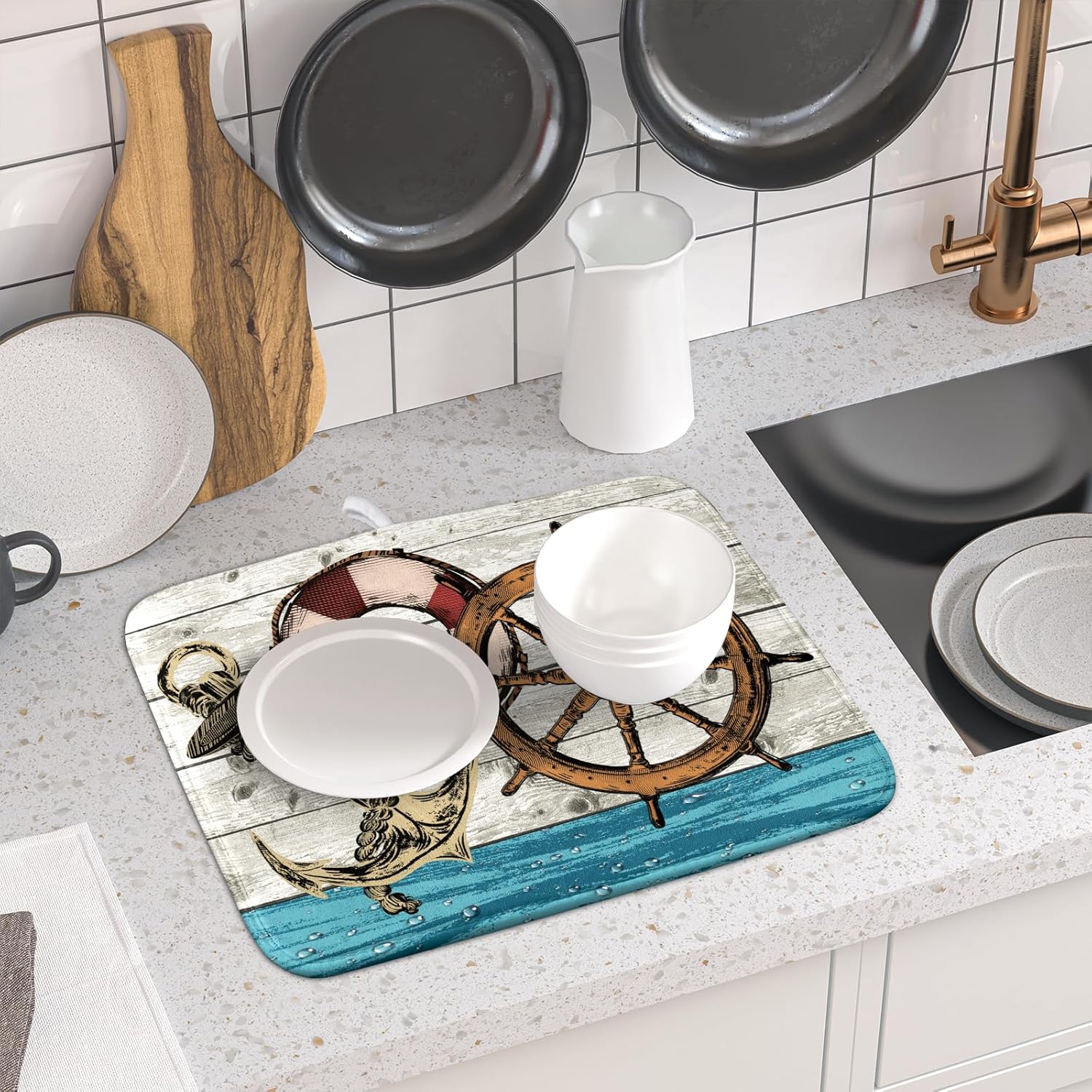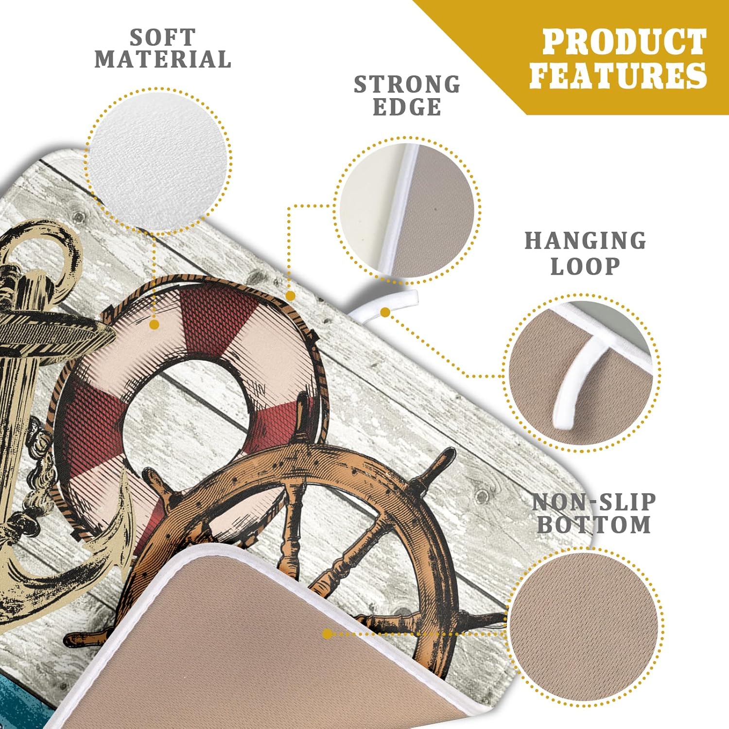 - 【Easy to Storage】This nautical rudder design drying mat with hang rope, soft and foldable, durable, easy to storage it by hanging or folding it up in a drawer or tuck it elsewhere. Perfect for tight spaces like campers, boats and cottages where having a dual purpose item will come in handy.
