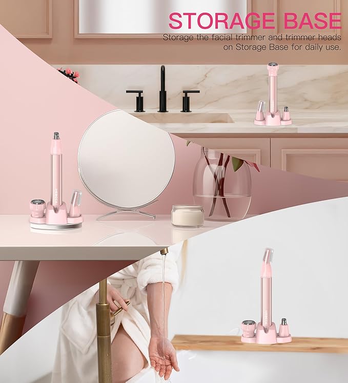 Nose Hair Trimmer for Women 3in1 Facial Hair Removal Trimmers with Storage Base - Waterproof, Portable USB Rechargeable with Travel Bag- Trims Nose, Ear, Eyebrow, Peach-Fuzz, Lips, Chin Face Hair