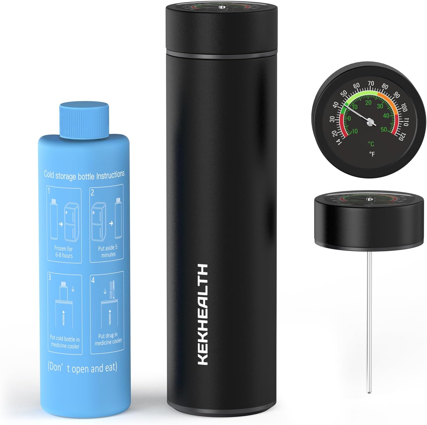 • 60-Hour Medical-Grade Protection: This insulin cooler uses 304 stainless steel and vacuum insulation to maintain critical 36-79°F temperatures for diabetes medications. The combination of a blue gel bottle (36-79°F/48H) and a white emergency bottle (36-79°F/12H) keeps medications at a safe temperature for up to 60 hours