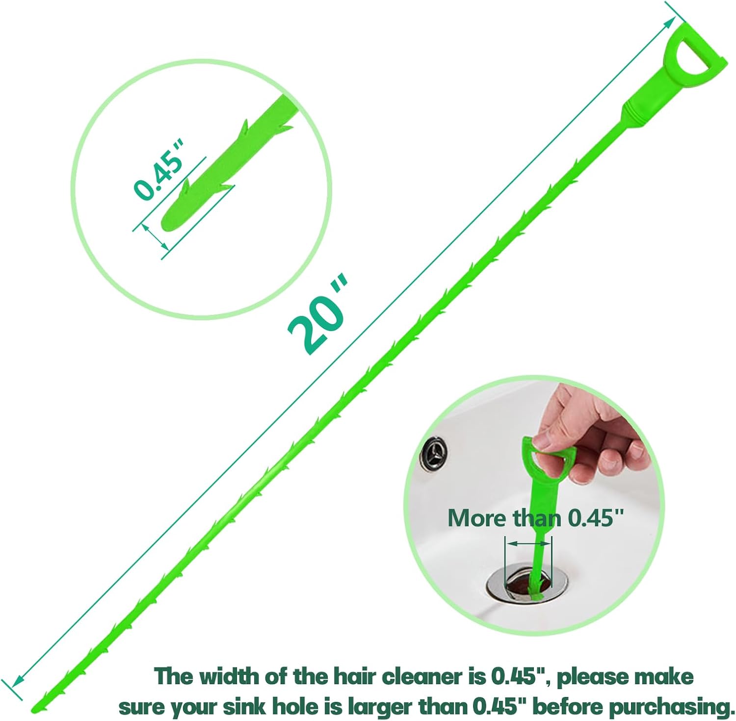 - Package Includes: 3 pack of 20" green drain clog remover cleaning tools. The width of the hair cleaner is 0.45", please make sure your sink hole is larger than 0.5" before purchasing