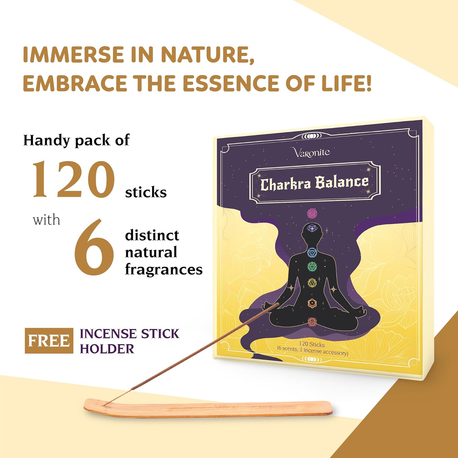 Incense Sticks - Charka Balance Incense Stick Variety Pack of 6 (120 Insence-Sticks) with Holder: Sandalwood, Bergamot, Jasmine, Lavender, Rose, Vanilla – 7 Chakras Inscents-Stick