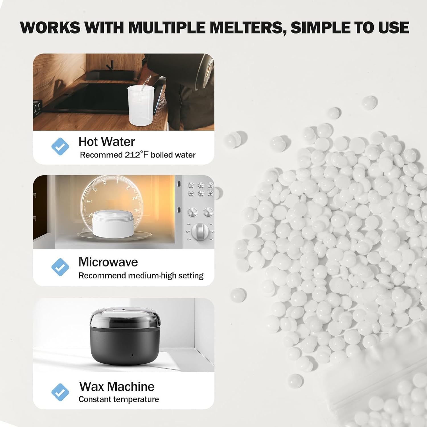 - Easy Melt with Multiple Method: Whether you’re using hot water, a microwave, or a wax warmer, our wax beads melt quickly and smoothly—no mess, no hassle. Perfect for easy, on-the-go hair removal whenever you need it