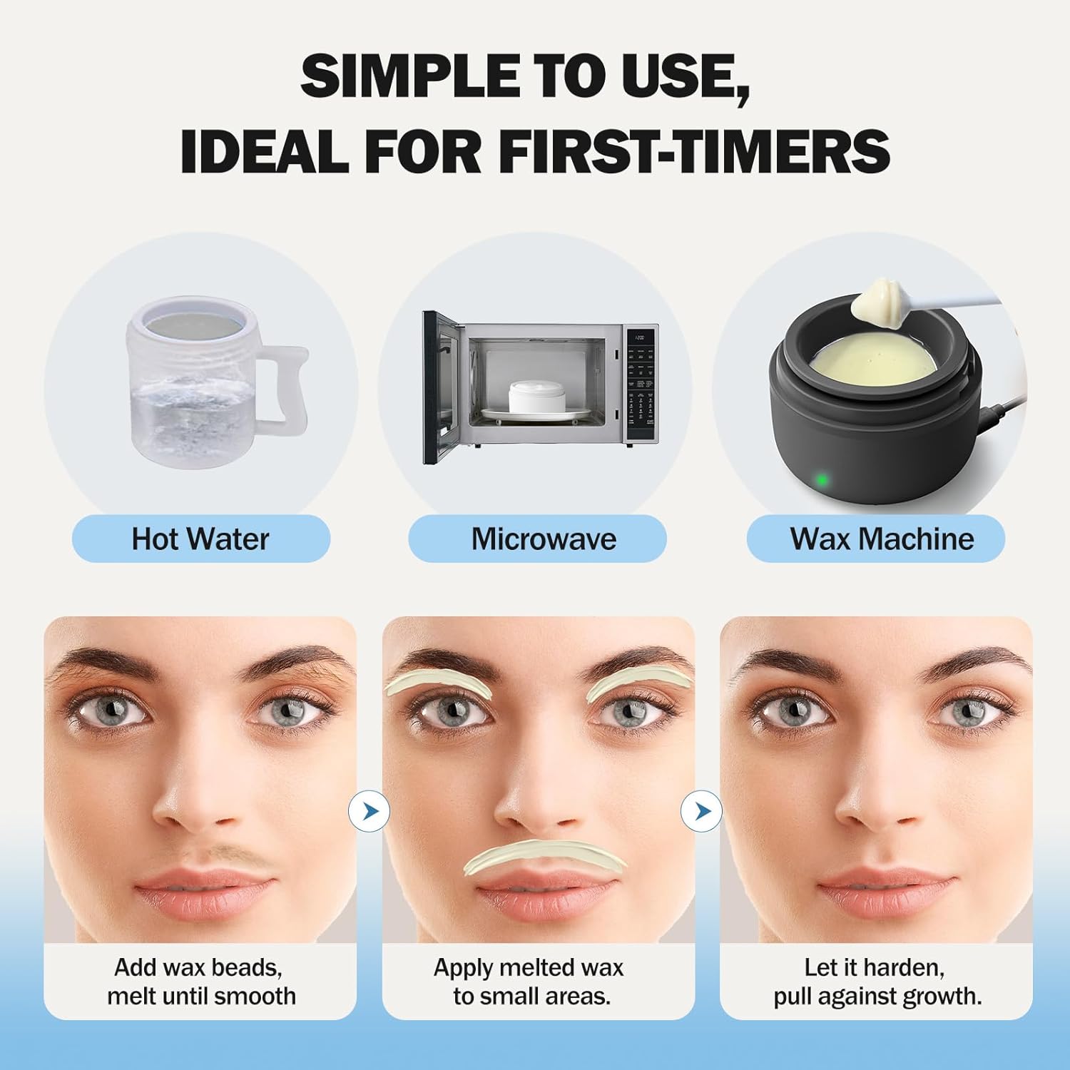 - How to Get Effective Hair Removal: 1. Pour wax beads into the heater and melt until smooth 2. Apply a small amount wax to your wrist to ensure it's not too hot. 3. Spread evenly in the direction of hair growth using the applicator 4. Wait a few seconds until the wax hardens slightly. 5. Pull off against hair growth in one swift motion. Tips: Do a small patch test to ensure no irritation. Clean and dry skin before waxing to improve wax adhesion
