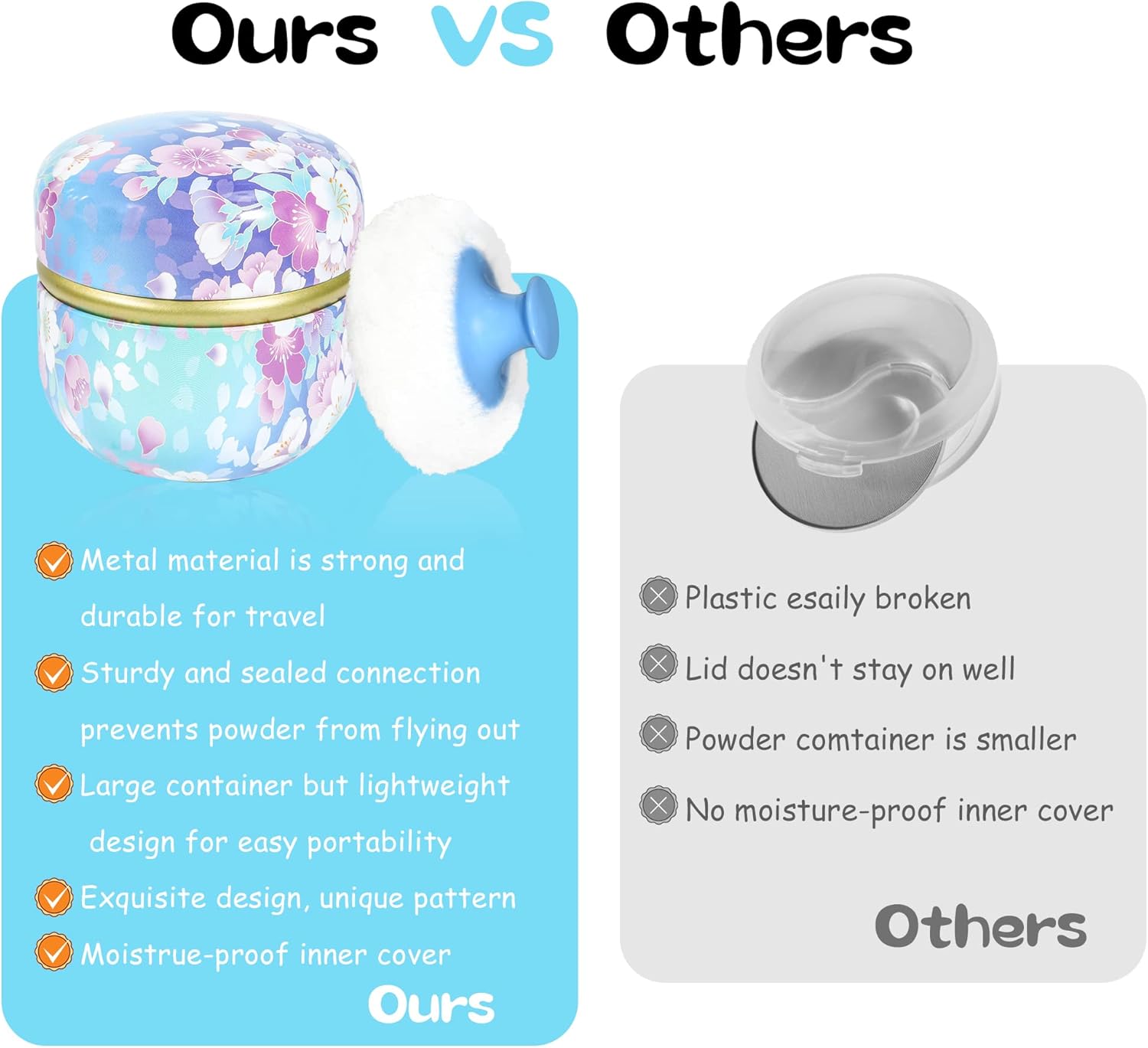 - The powder box has a delicate appearance and a variety of patterns for you to choose. The powder box is made of high-quality tinplate, which are not easy to break after being dropped, and not fade easily, and can be used for a long time. There is also a lid inside the powder box, so you don't have to worry about spilling powder.