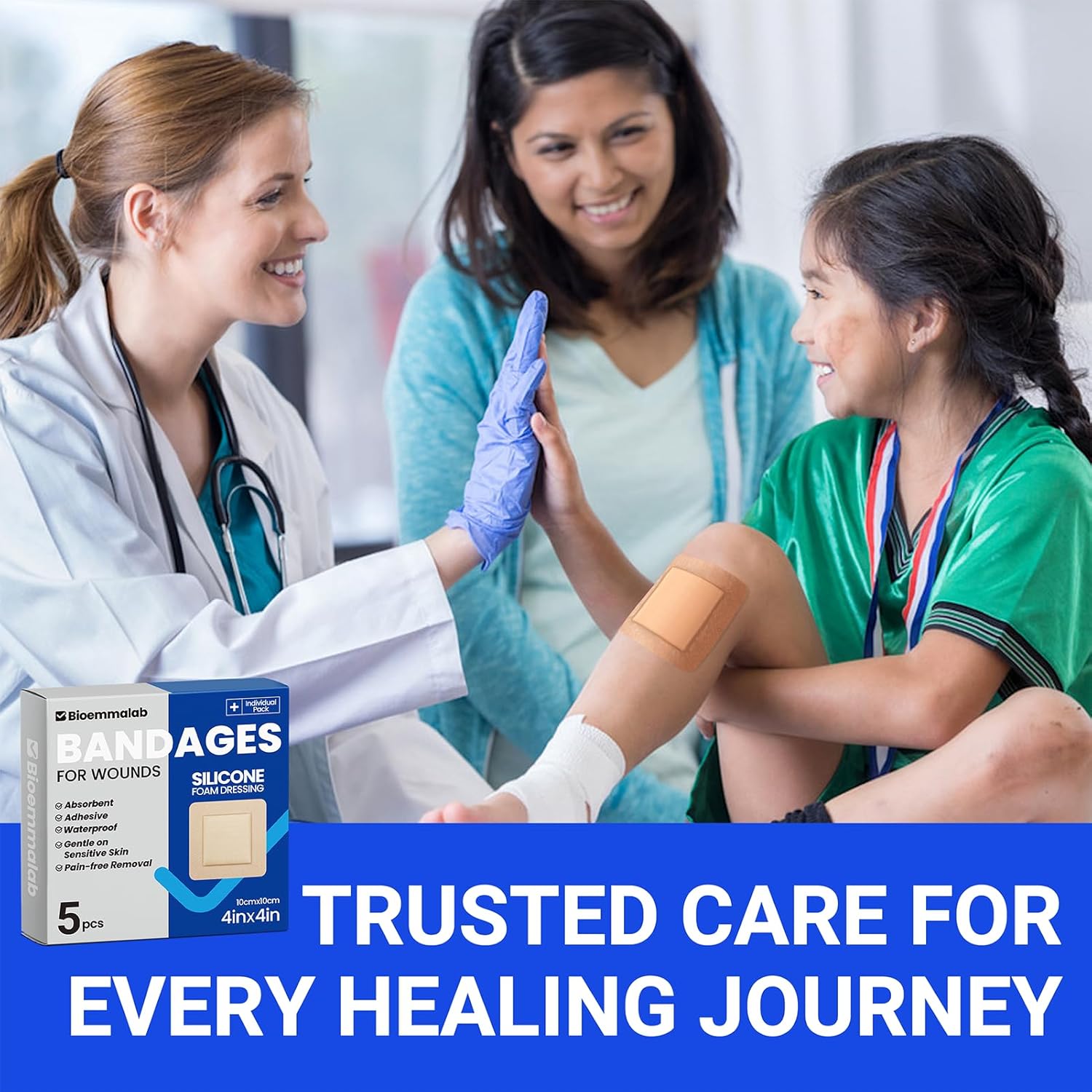 Large Waterproof Bandages 4X4 Silicone Foam Dressing for Sensitive Skin Wound Care, Adhesive Cohesive Pad with Border for First Aid, Post Surgical and Burn, Pressure, Scar Healing (5 PCS)