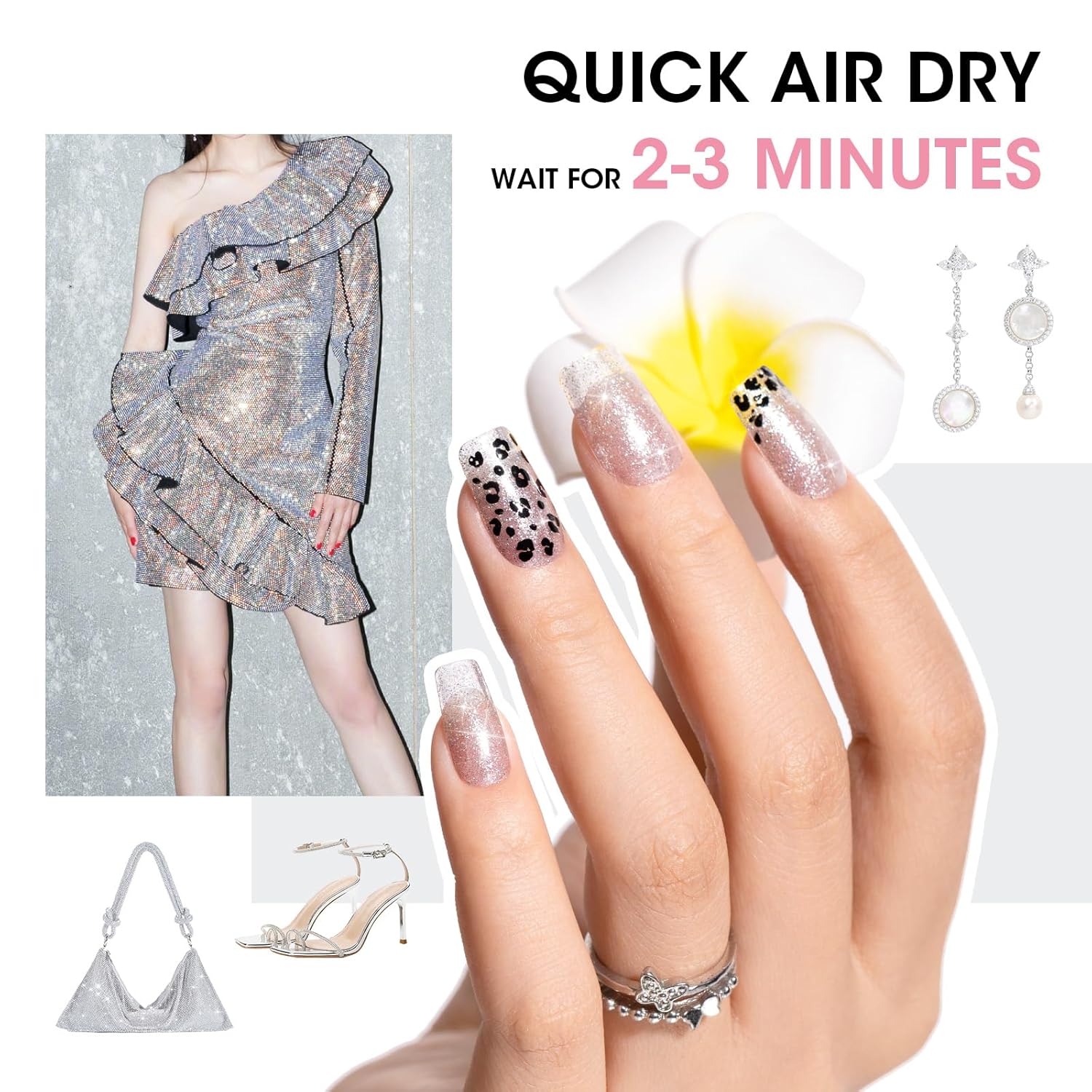 - Easy to Apply: 1, CIean and dry the nail surface. 2, Apply base coat and air dry for 2-3 minutes. TIPS: If humid or cold, air dry for 3-5min, if hot, air dry for 1-2min. 3, Apply first layer color and air dry for 2-3 minutes. Keep thin for first color layer. 4, Apply second color layer, air dry for 2-3 minutes. 5, Apply top coat and air dry for 2-3 minutes. 6, HOW TO REMOVE: Cover the nail surface with a nail remover pad for 5-10s and then wipe off.