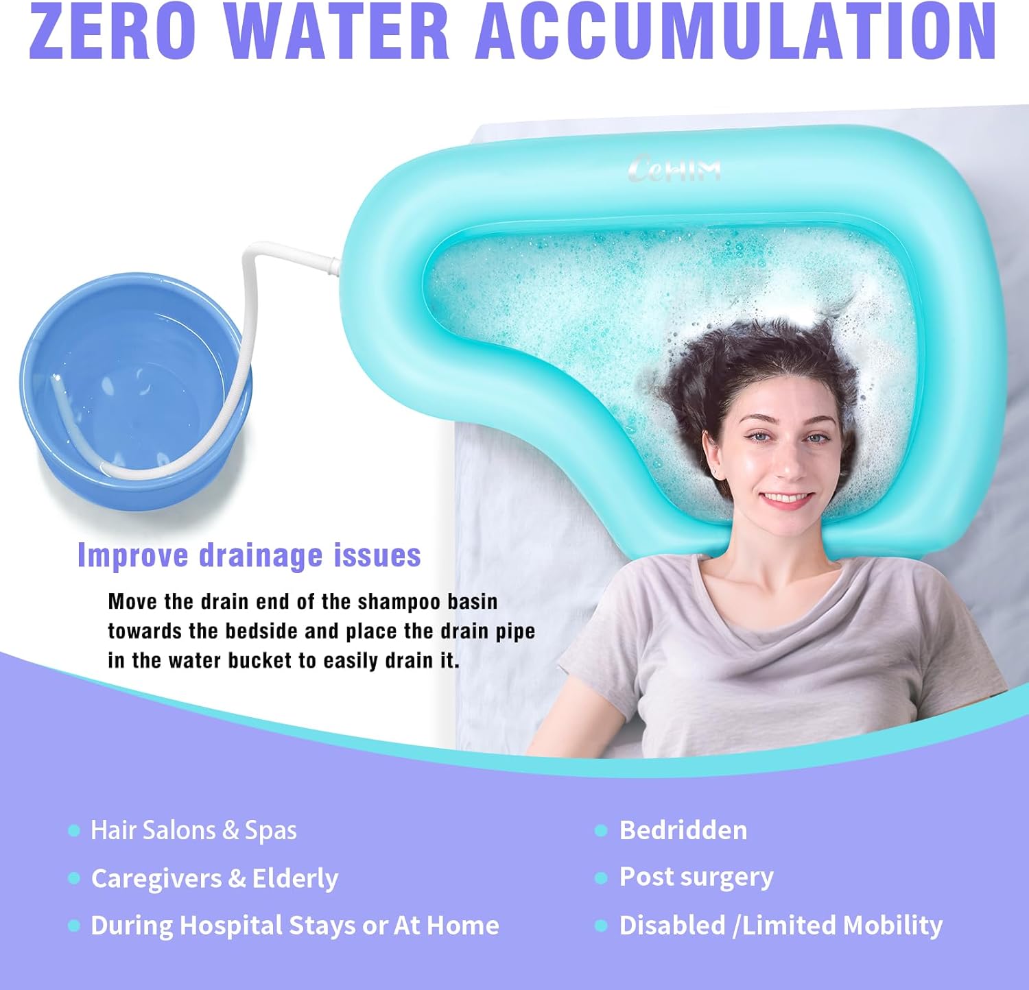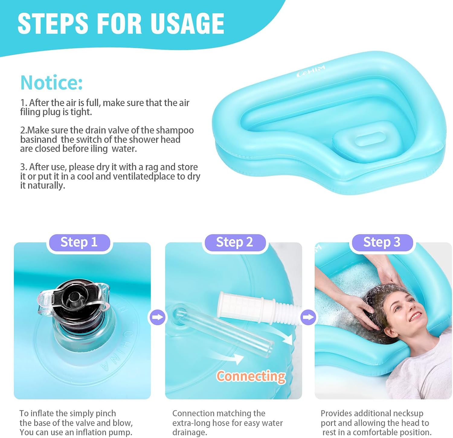 - 【Zero Water Accumulation】 CEHIM large inflatable wash basin (32.8 x 22 x 7.08 inches) features an upgraded Angled Design Ensures Complete Drainage, ergonomic neck support, and built-in pillow for superior comfort while washing hair at bedside for elderly, children, and post-surgery patients. Perfect for home/salon use!