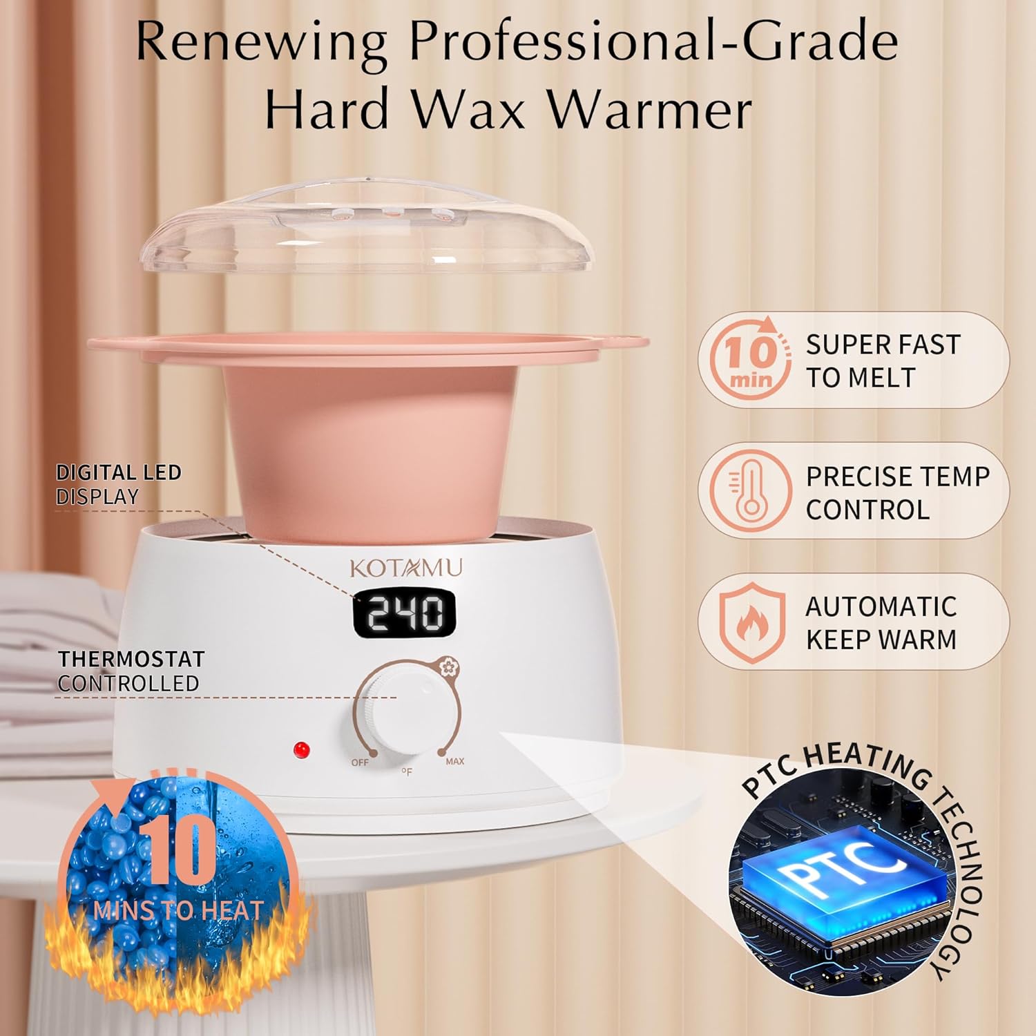 - Fast Heat Up & Precise Temp Control: Wave goodbye to wasted time! Our KOTAMU hard wax kit for hair removal introduces a digital wax machine that melts waxing beads in just 10-15 minutes. Ideal for busy lifestyles, this body wax kit keeps a steady temperature for a quick, safe, and smooth waxing session. Skip the salon queues and enjoy the speed and convenience of professional at-home hair removal!