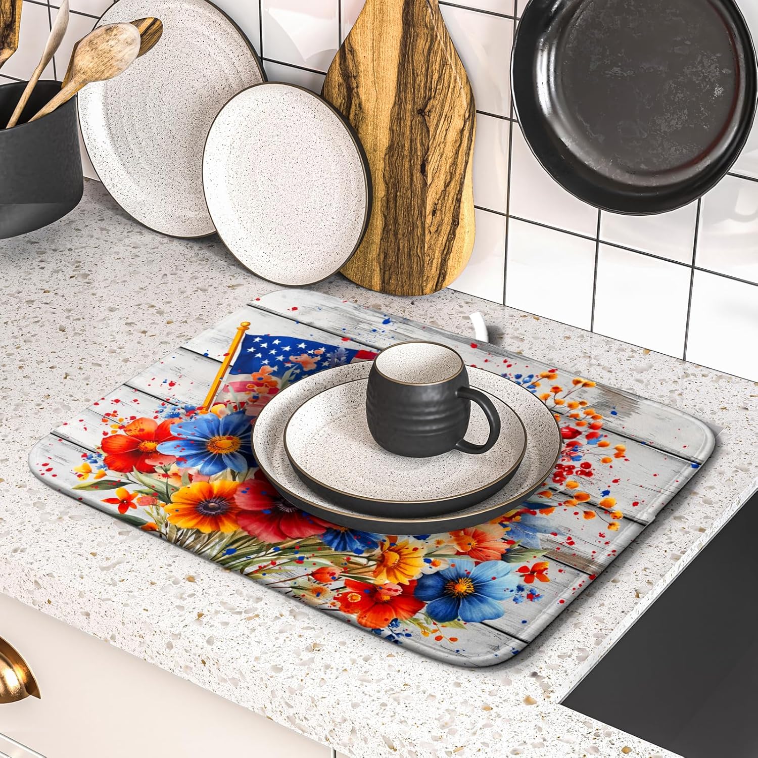 - 【Protect Tableware】Place your dishes on it or under dish racks, the Independence Day dish mat prevents bowls, glassware, and more tablewares from being scratched or worn, can be used as dish drying mat, sink mat, dishes drainer mats to keep the countertop dry and tidy.