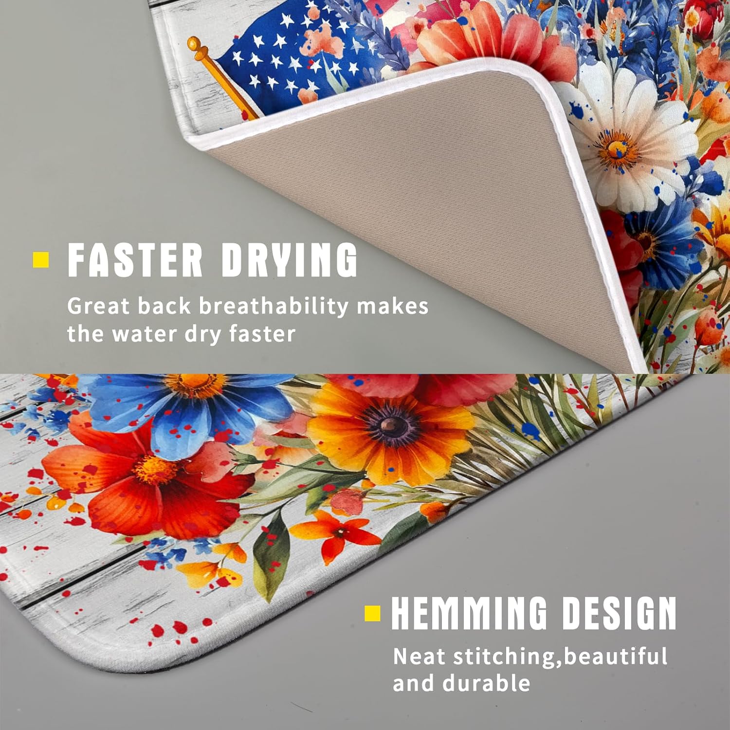 4th of July Dish Drying Mat 16x18 inch Patriotic Floral Fast Dry Microfiber Reversible Dish Drainer Rack Pad Kitchen Counter Accessories