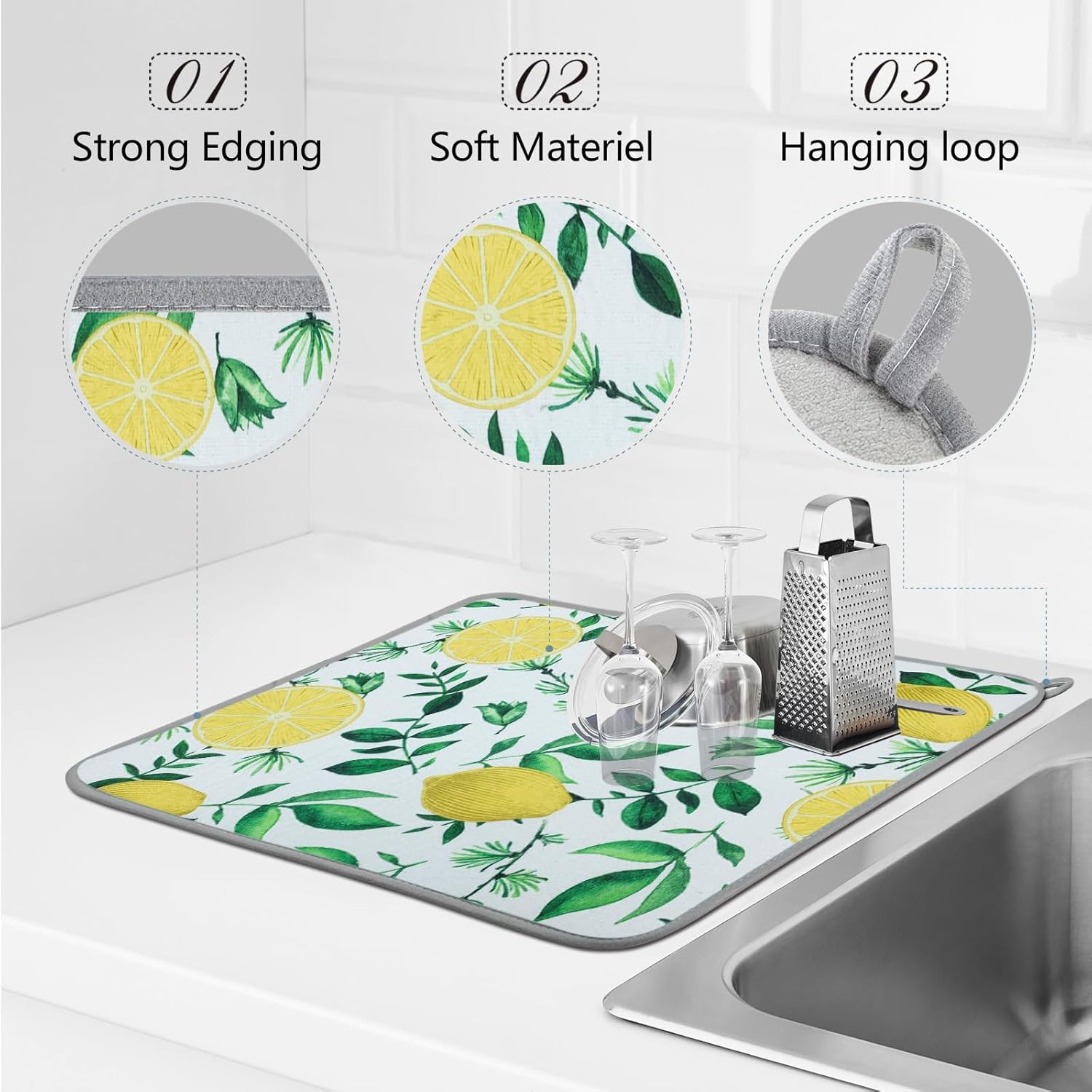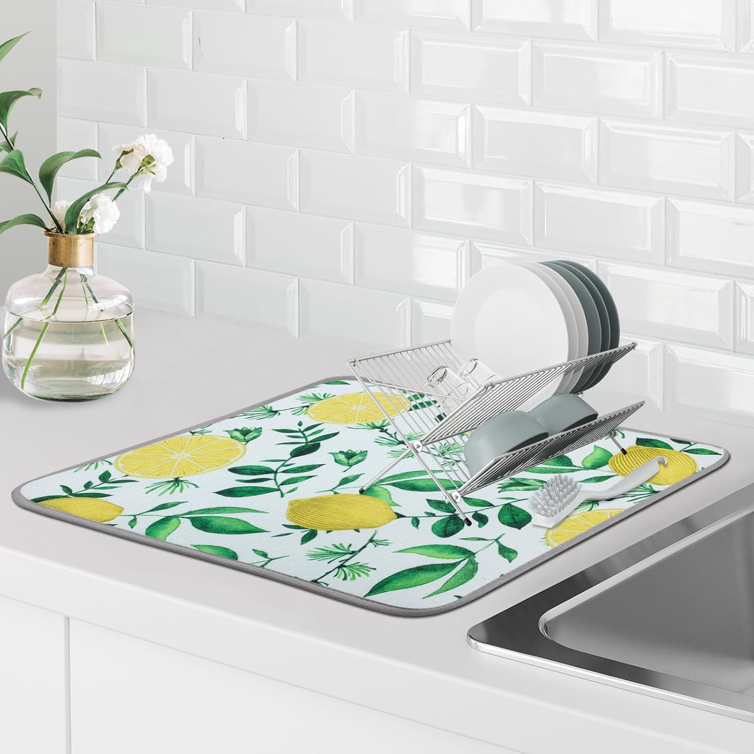 SHIYUE Dish Drying Mat for Kitchen Counter Super Absorbent Spring Kitchen Decor Microfiber Drying Matainers Rack Fast Pad Dish Drainer Mats(Yellow Lemon Green Leaves,18''x24'')