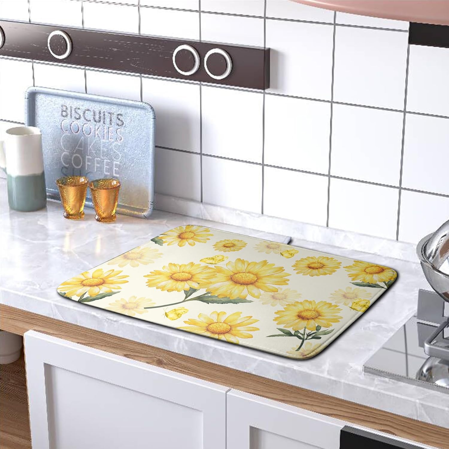 Yellow Sunflower Dish Drying Mat for Kitchen Counter Summer Daisy Floral Dishes Pad Farmhouse Flower Dish Draining Microfiber Absorbent Dish Drainer Rack Mat Large Extra Large 18x24 Inch
