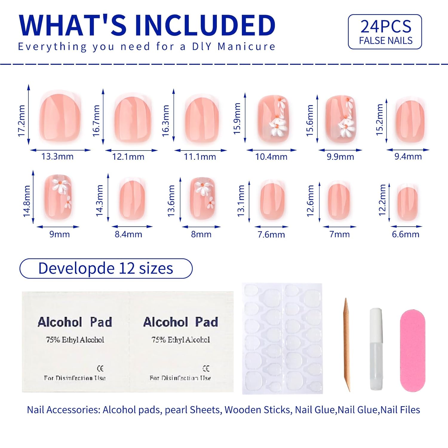 French Nude Press On Nails Short Square, Summer Fake Nails with White French Tip and 3D Daisy Flower Design, Glossy Gel Finish Acrylic Nails, Natural Reusable Glue On Nails Kit for Women, 24 Pcs