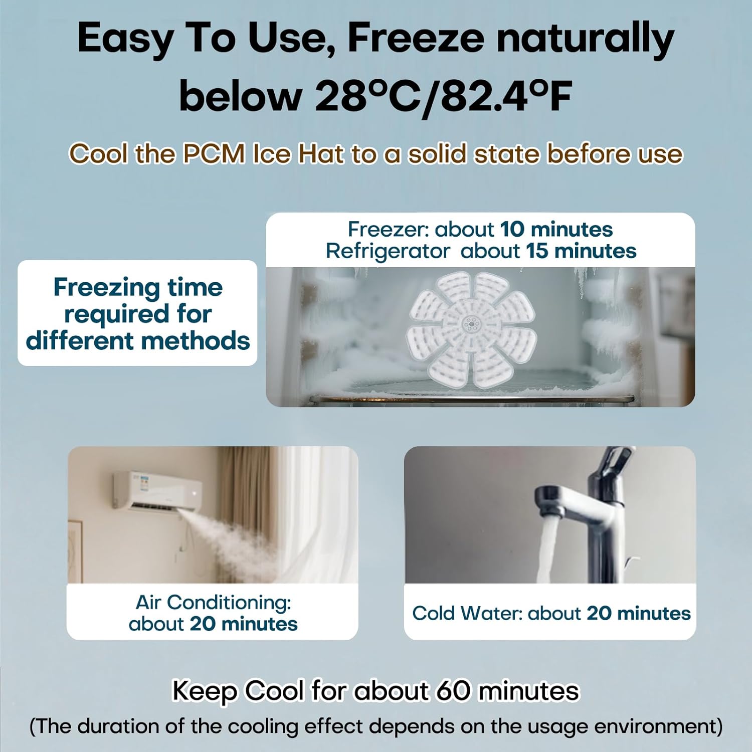 - Quick Freezing: Just put it in the freezer and freeze it for 10 to 15 minutes, enjoy up to 1 hour of coolness. By cooling the head, you can cool the whole body, Effectively cool down and prevent heat stroke. In cold water or air-conditioned environment, it takes 20 minutes to freeze, Until the pcm contents become solid. The specific freezing time may vary depending on the room temperature, The longer the freezing time, the better the effect.