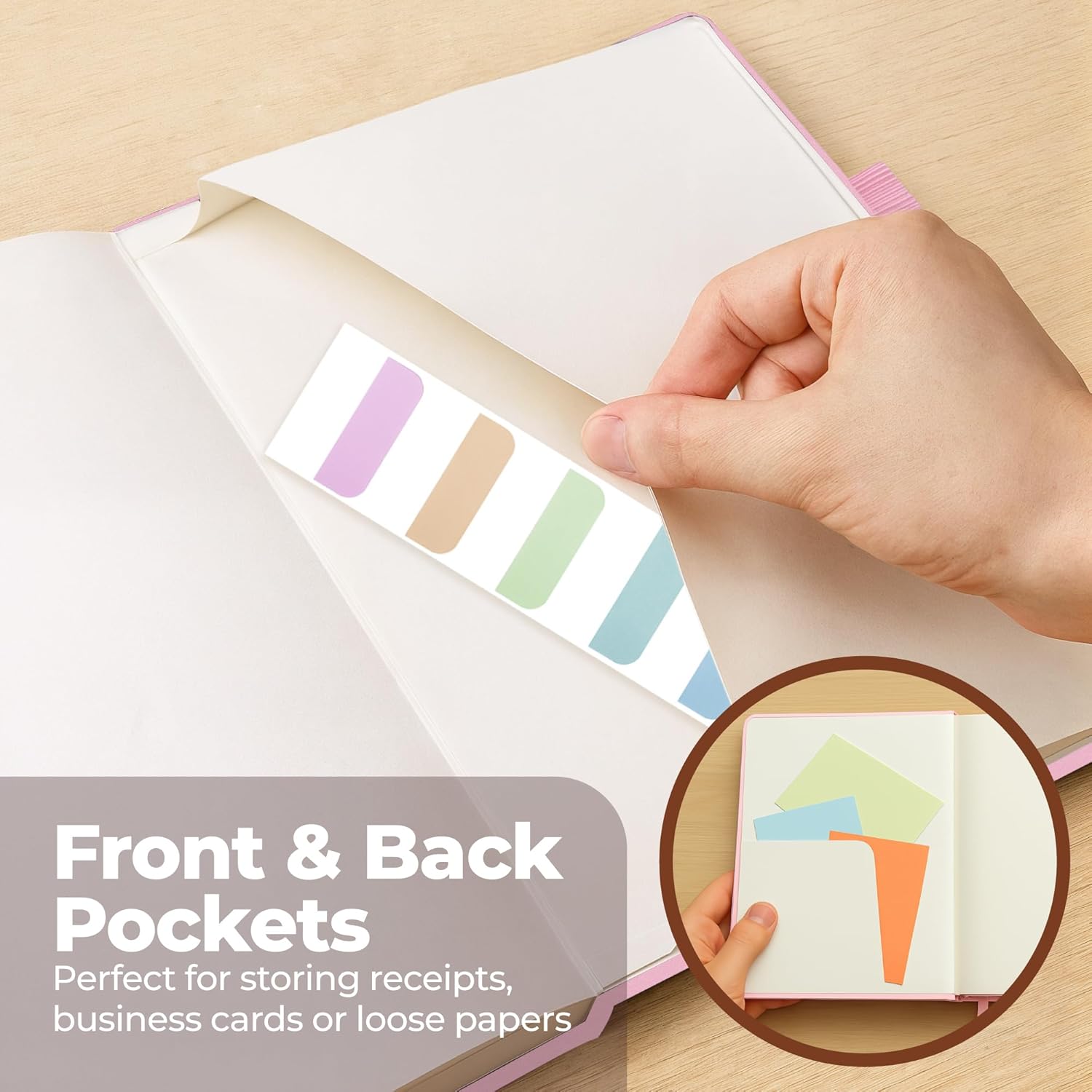 - DESIGNED WITH FUNCTIONAL FEATURES – Stay organized with built-in front and back pockets for loose notes or stickers, elastic closure band to keep pages secure on the go, and dual ribbon bookmarks to quickly find important sections. The pen holder means your favorite writing tool is always within reach. And it also comes with free sticky tabs to mark pages, organize sections, and quickly find your most important notes!
