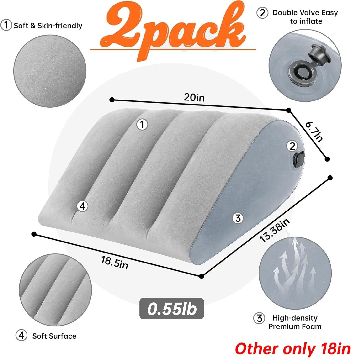 Portable Inflatable Wedge Pillow 2 Pack,Body Positioner for Sleep Support, Large 20in Adjustable Travel Cushion - Lightweight Bed/Leg/Partner Support Pillow, Fast Inflation, Grey