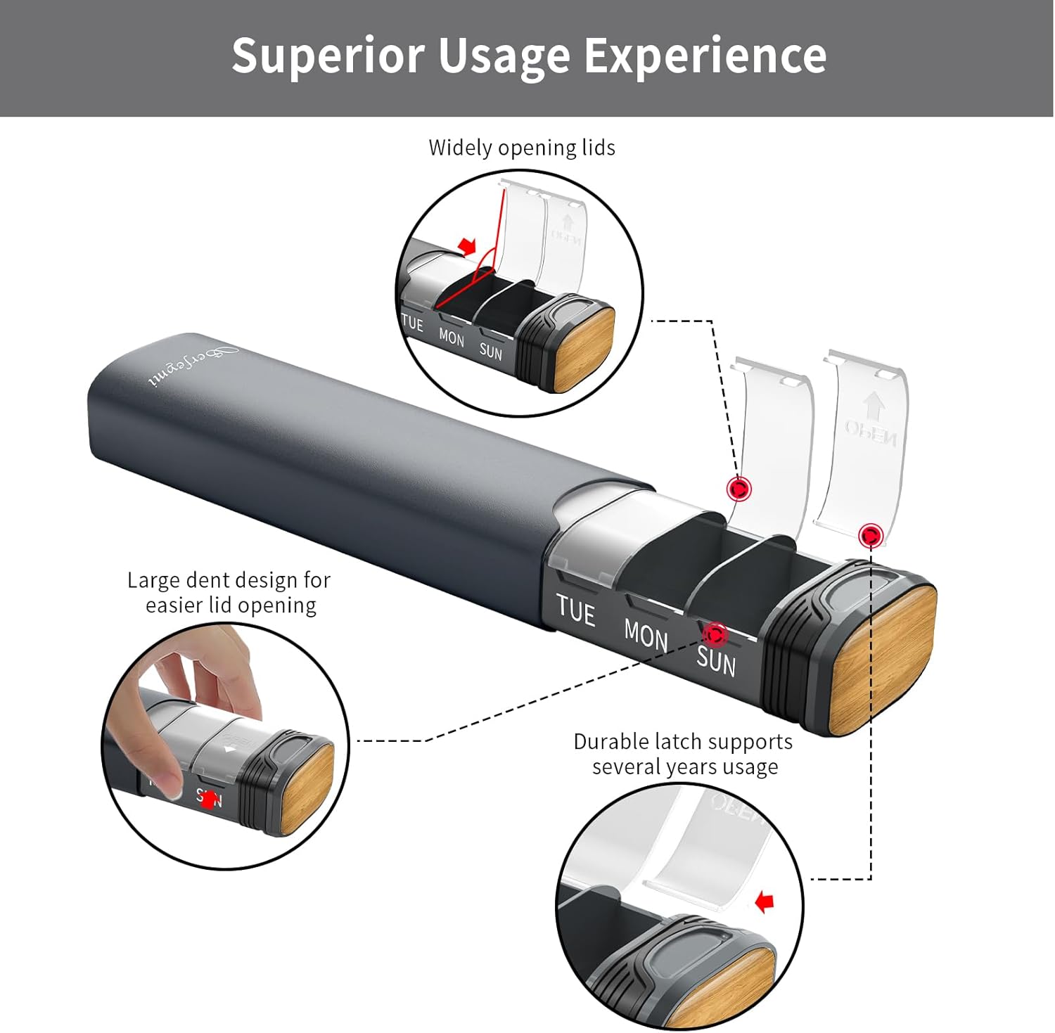 - UPGRADED INDIVIDUAL LIDS- Unlike the lids of most pill boxes on the market that use plastic hinges (which can cause the lid to detach due to plastic fatigue), our design employs a latch mechanism that ensures the lid remains securely in place for years without detaching. Thanks to the ergonomic design, the lid's optimal tension ensures ease of use without excessive tightness, making it arthritis-friendly for effortless access
