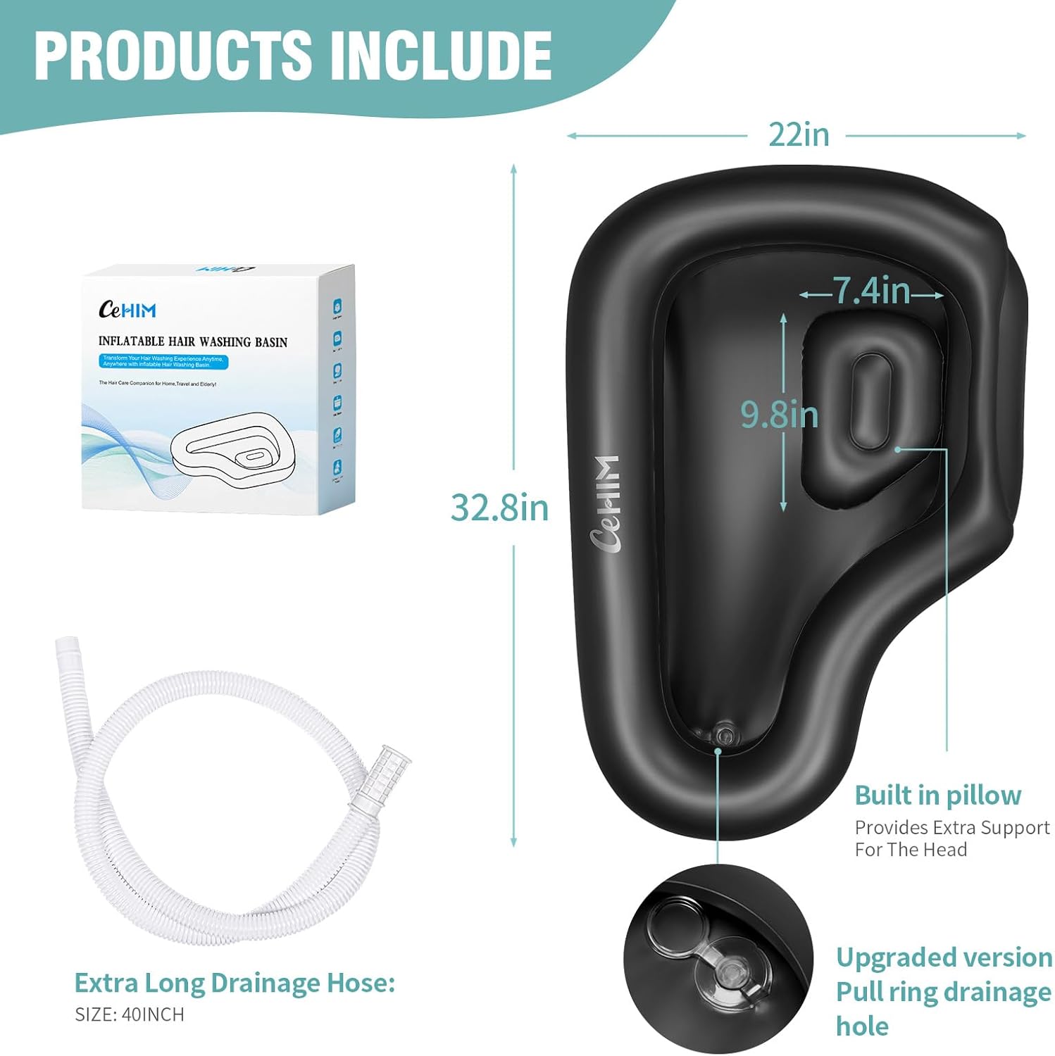 - 【Portable Bedside Shampoo Basin with Zero Water Accumulation】: CEHIM’s large inflatable shampoo basin (32.8 x 22 x 7.08 inches) has an upgraded angled design for complete drainage, eliminating water buildup. It features ergonomic neck support and a built-in pillow for comfort during bedside hair washing—ideal for the elderly, kids, and post-surgery patients. This portable bedside shampoo basin fits home and hospital use, solving hair-washing hassles for those with limited mobility. Deflates small for RVs/campgrounds, making on-the-go hair care easy.