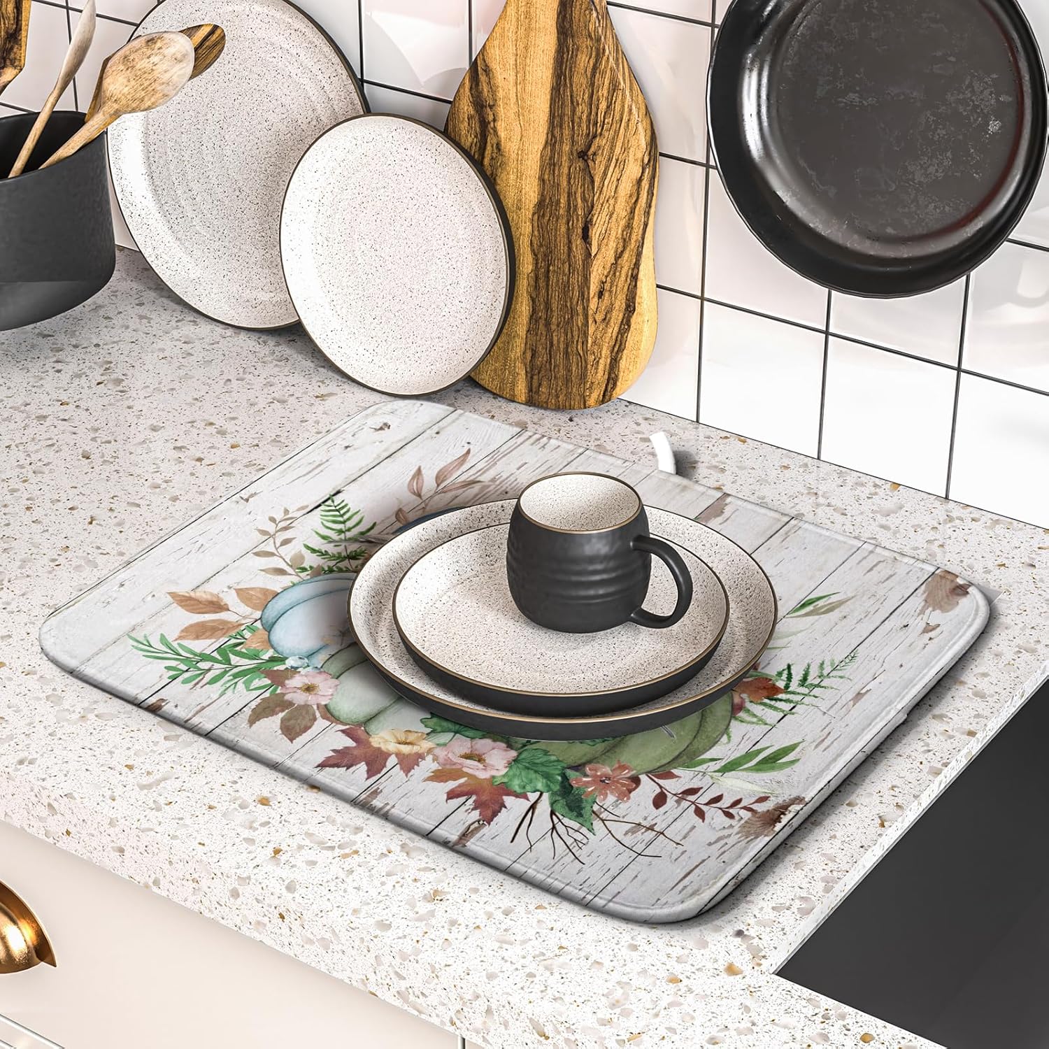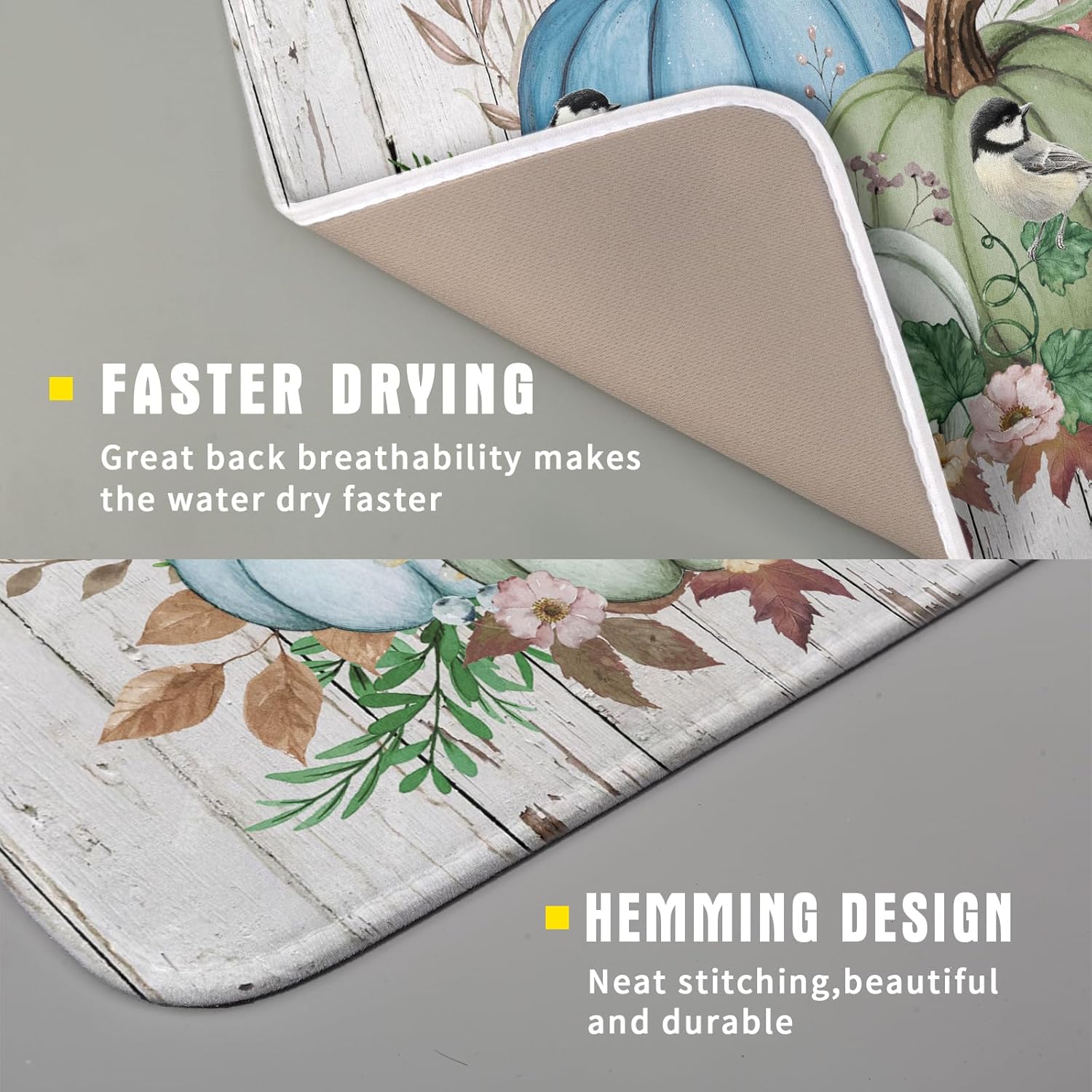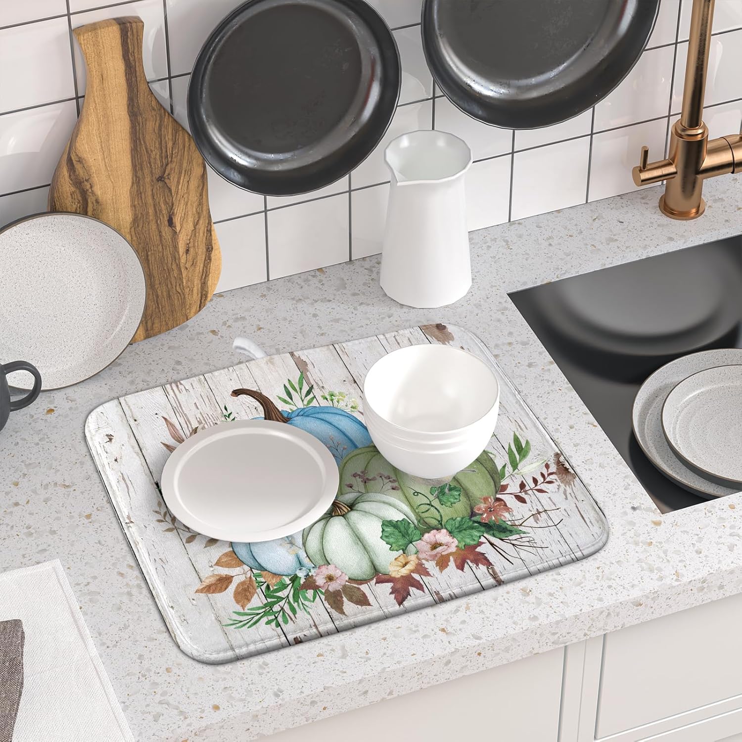 - 【Protect Tableware】Place your dishes on it or under dish racks, the autumn pumpkin dish mat prevents bowls, glassware, and more tablewares from being scratched or worn, can be used as dish drying mat, sink mat, dishes drainer mats to keep the countertop dry and tidy.