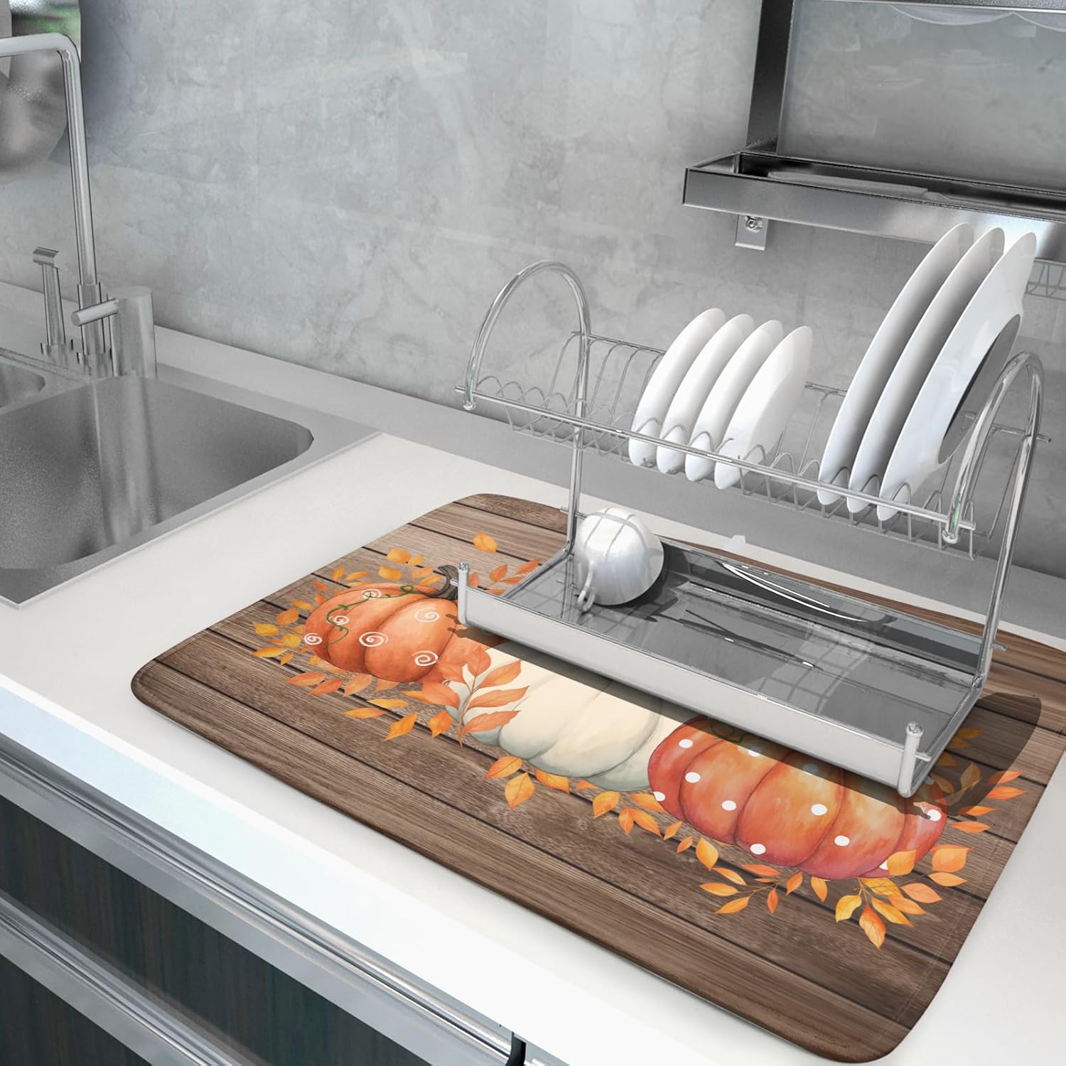 - 【Protect Tableware】Place your dishes on it or under dish racks, the fall pumpkin dish mat prevents bowls, glassware, and more tablewares from being scratched or worn, can be used as dish drying mat, sink mat, dishes drainer mats to keep the countertop dry and tidy.