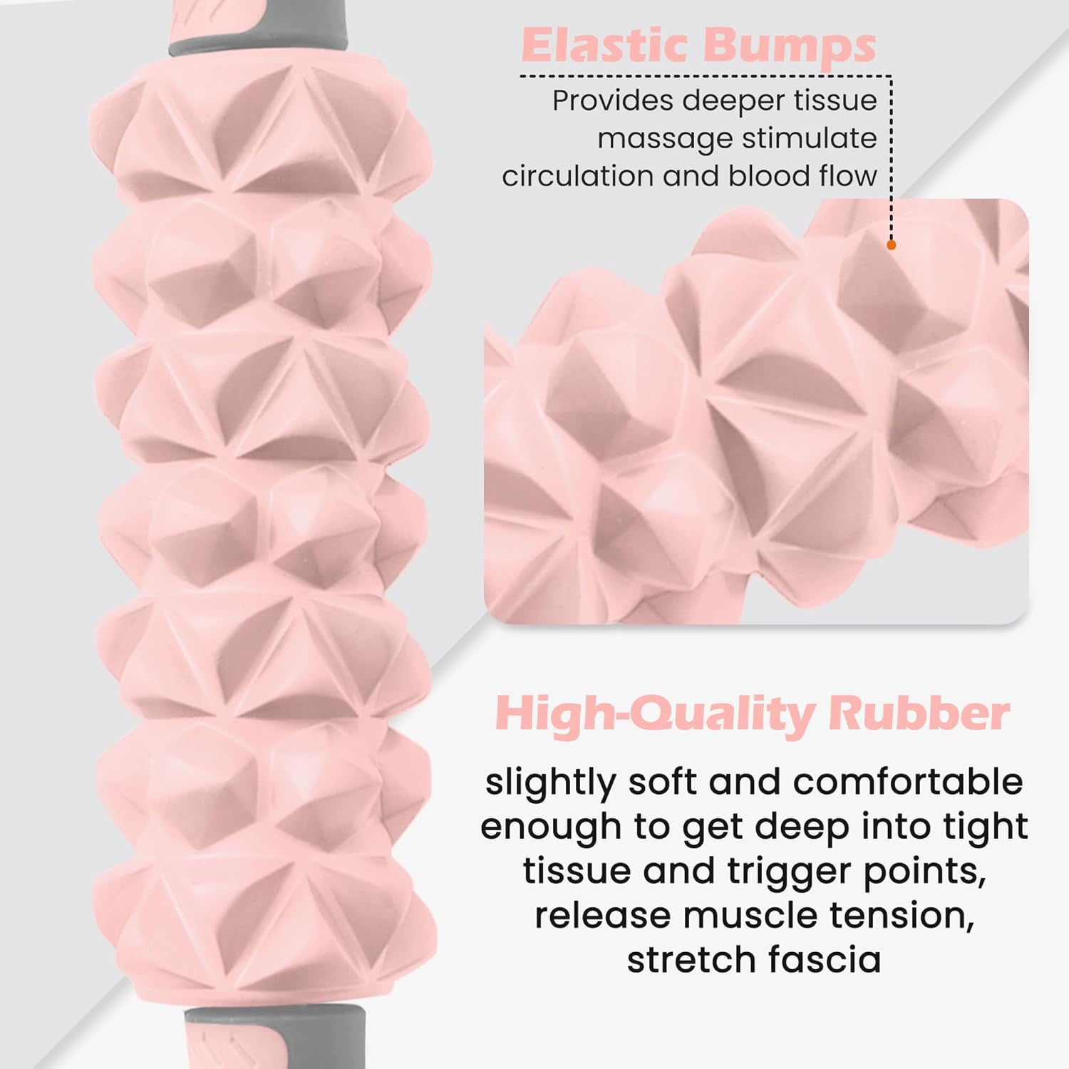 - For Relaxation: Dual grips with textured surface rubber on each grip for more stability and comfort when holding and using. The massage stick elastic bumps provide deeper tissue massage, stimulate circulation and blood flow