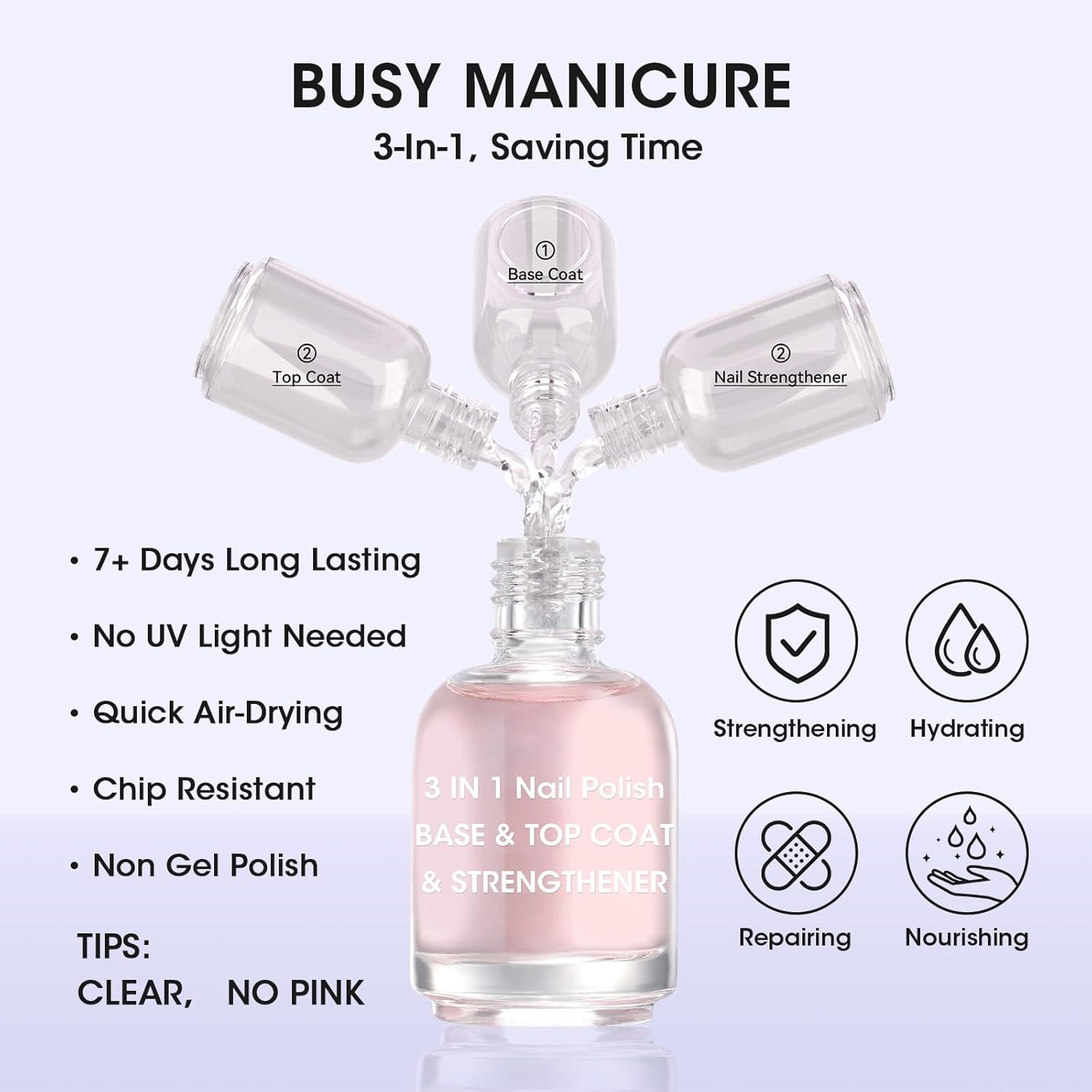 - Model Name : 3-In-1 Clear Nail Polish Base Top Coat & Nail Strengthener, Clear No Pink