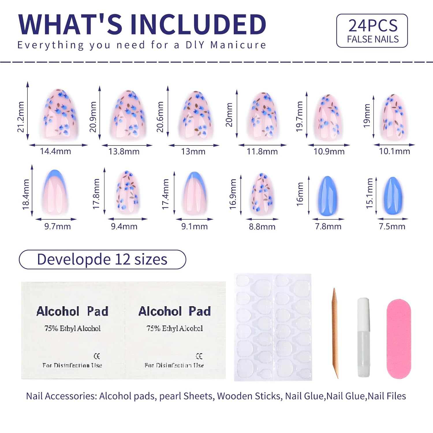 - Package Includes: 24 pcs stick on false glue on nails kit, each box includes 24 short press on nails, 1 sheet of 24 sticky nail pieces, 1 cuticle stick, 1 double sided nail file and gel press on nails cleaning pads, a small tube of nail glue,All the tools you need to apply the nails are included in one set